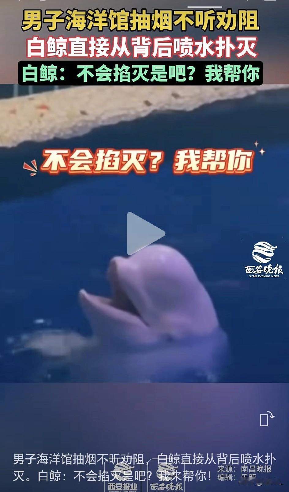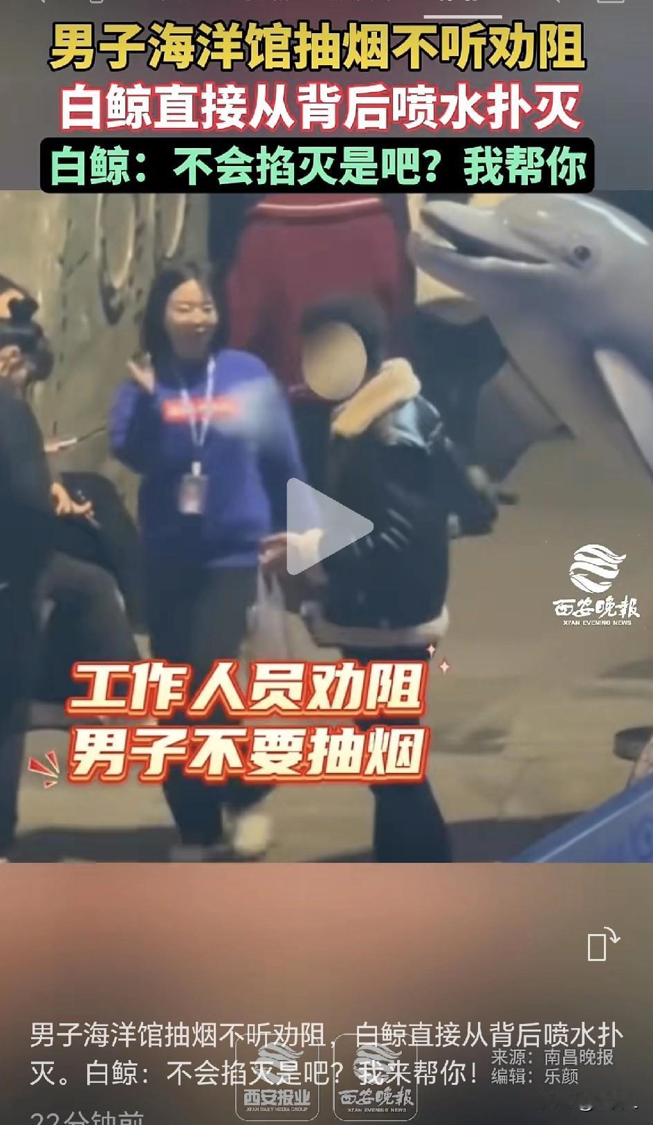 大连海洋馆惊人一幕:男子违规吸烟,白鲸“神操作”喷水精准浇灭!现场一片叫好:干得漂亮! 12月7日,辽宁大连某海洋馆里发生了一件让所有游客目瞪口呆的事。 一名男游客在展示区附近点起香烟,工作人员上前劝阻,他却理直气壮不肯配合。谁也没想到,接下来“出手”的竟不是人—— 池子里一头白鲸悄悄游到男子身后,突然仰头喷射出一股水柱,不偏不倚,正好把男子手里的烟浇灭了!水柱势头不小,顺带把男子从头到脚淋了个透。 现场有人拍下全程:白鲸在行动前,还在水里“潜伏观察”了一会儿,动作特别拟人。而男子回头时那一脸错愕,和白鲸“淡定”的样子形成了搞笑对比。 视频传到网上,瞬间火了。 超过九成网友直呼: “干得漂亮!” “白鲸是不是培训过专治不服?” “这鲸鱼能处,有烟它真浇!” 评论区几乎一边倒地支持白鲸,不少人都说: “连动物都看不下去公共场所吸烟了。” “建议给白鲸加餐!” “建议全国推广白鲸保安!” “它真的……我哭死……好有正义感的鲸!” “吸烟的这位,现在全网都知道你被鲸鱼‘制裁’了。” “为海洋宝宝点赞!” “我都想拿个水枪滋!” 截至目前,海洋馆还没有详细解释白鲸这一波“操作”是巧合还是“有备而来”,但这件事已经成了全网热点。 不少网友感慨:公共场所吸烟问题呼吁多年,没想到这次是一只白鲸吸引了所有人的关注。 或许这也提醒我们,文明和环境,连动物都在乎。 关注我@芷卿L ,第一时间分享热点现场与社会趣闻。 信息来源于西安晚报,侵联删!