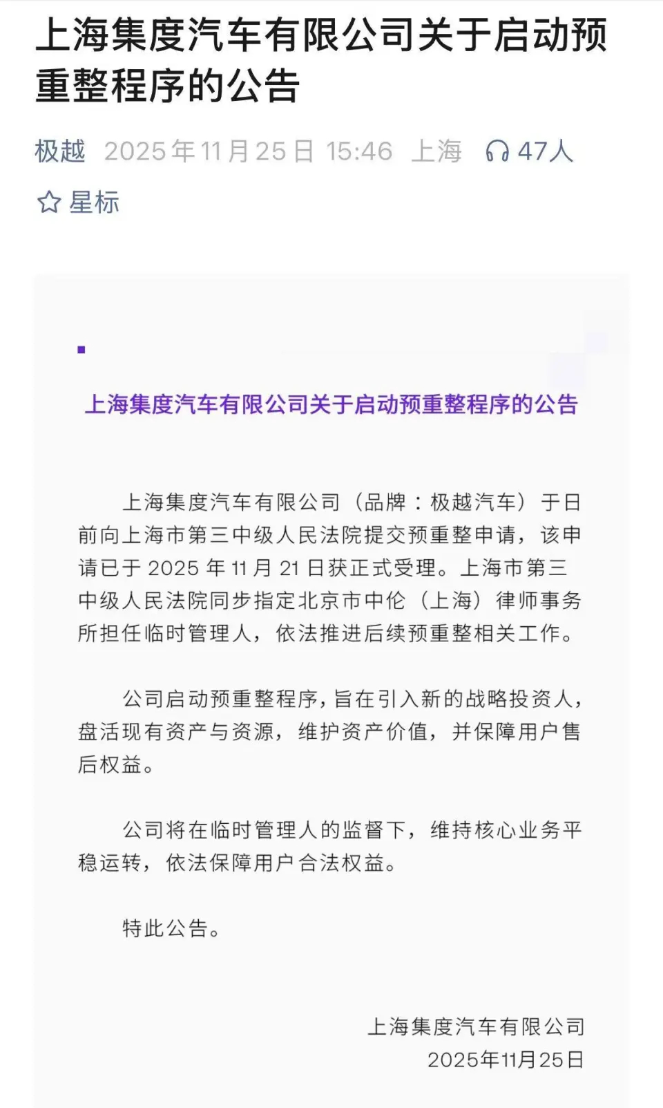【纷纷官宣新动态 哪吒极越威马汽车要复活了吗?】进入12月,中国车市的年终冲刺与重整自救,正在同步上演。一方面,主流车企正抓住最后一个月的窗口期,全力冲刺年度销售目标。这既是为了卖出更多车,也是为了实现“盈利”的目标。另一方面,此前已宣告破产、停工停产的汽车品牌,陆续官宣新动态,试图抓住机会上演一场绝地求生的“复活”戏码。12月4日,合众新能源汽车股份有限公司(哪吒汽车实体公司,以下简称为“哪吒汽车”)发布共益债投资人招募公告,面向社会公开招募共益债投资人。仅仅2天前,哪吒才刚刚发布了公开招募经营管理委托方的公告,展现出了积极的“复活”信号。事实上,不只哪吒,包括极越(上海集度汽车有限公司)、威马等在内的已陷入破产困境的新造车品牌,均在11月官宣了与破产重组有关的消息。上海集度汽车的企业状态为“存续”,法定代表人仍为夏一平。时代周报记者就预重整申请及后续规划等问题咨询夏一平,截至发稿尚未收到回应。更早之前,由高合汽车母公司华人运通持股30.2%的 “江苏高合汽车有限公司”也宣告成立,经营范围涵盖新能源汽车生产、零部件研发等核心领域。只不过,在当前我国新能源汽车市场渗透率已超过50%的背景下,不少仍在“场上”厮杀的车企都承受着压力。上述几家已经停摆2年、3年车企,“复活”的进展如何?“破产”新势力,掀起“重组热潮”?合众新能源管理人账号信息显示,自今年6月发布“合众新能源汽车股份有限公司公告及债权申报通知”以来,该公司已经陆续对外披露了数条信息,涉及意向投资人预招募、破产重组案第一次、第二次债权人会议通知,以及最新的共益债投资人招募公告等。根据4日发布的招募公告,本次计划融资总额不超过人民币1亿元。融资用途主要涵盖:支付维持债务人核心业务继续运营的必要开支;支付对债务人核心生产线设备等的维护、修缮及保值增值费用;支付为维系车主正常、安全使用“哪吒汽车”的车机、售后等各类座舱供应商费用等。然而,根据浙江嘉兴法院正式受理哪吒汽车母公司合众新能源的破产重整申请的信息显示,1631家债权人申报债权总额已达265.8亿元与哪吒还处于“找钱”阶段相比,威马的“复活”速度似乎更快一步。天眼查App显示,11月27日,由威马汽车制造温州有限公司全资持股的智马行(温州)新能源汽车销售有限责任公司成立,注册资本2亿元人民币,经营范围包括新能源汽车整车销售、新能源汽车电附件销售、汽车销售等。11月初,威马汽车还通过官方微博宣布了“小威随行APP即日起重新上线”的消息,蓝牙车控、远程车控、蓝牙钥匙、车辆信息同步等功能成功恢复。更早之前,威马汽车重整投资人深圳翔飞汽车销售有限公司(以下简称深圳翔飞)还发布了《致供应商白皮书》(以下简称《白皮书》),披露了车型复产计划、三阶段战略目标和团队与资金保障等信息。无独有偶,在2024年12月陷入停摆的极越汽车,于11月25日发布了“上海集度汽车有限公司关于启动预重整程序的公告”(以下简称“公告”)。公告提到,预重整申请已于2025年11月21日获正式受理。启动预重整程序,旨在引入新的战略投资人,盘活现有资产与资源,维护资产价值,并保障用户售后权益。“保资质”或是更现实的目标?只不过,即便企业态度积极,但“复活”成功的概率有多大?一方面,市场并未给出积极的回应。根据哪吒发布的“关于重整投资人公开招募结果的公告”,截至意向重整投资人报名截止日,仅一家意向重整投资人按要求完成报名工作。另一方面,重启生产并非易事。根据威马《白皮书》,其2025年至2026年为复兴阶段,计划在2025年9月复产EX5和E.5车型,年度销售目标为1万台,力争达到2万台,并布局泰国KD工厂,开拓东南亚及中东市场。梅松林告诉时代周报记者,不管是启动预重整,还是成立销售子公司,抑或是公开招募经营管理受托方,这些车企“复活”的概率都不大。“当初占尽天时地利人和的优势,都没能在市场立足。如今想再加入战局,相当于用三年前的技术和产品和当今的技术产品竞争,胜算很低。”梅松林直言。惠誉评级亚太区企业评级董事杨菁则认为,对于试图“复活”的品牌来说,最大的挑战是如何恢复消费者信心以促成规模化生产与销售。“在目前的汽车零售市场竞争环境下,重振弱势品牌的难度较大。想要复产复工,上述车企在重组后或需要找到合适的2B渠道和商业模式以支撑其可持续运营。”但在梅松林看来,哪吒、威马、极越等企业积极推进重组背后,主要原因或在于股东希望通过重组盘活现有资产。其中,工厂与生产资质尤为重要。根据《道路机动车辆生产企业和产品准入办法》,乘用车企业若连续两年年均产量不足 2000 辆(即 “不能维持正常生产经营”),将被工信部特别公示,继而将面临车辆准入暂停、进入观察期,最终可能被取消生产资质。“资质一旦被取消,再拿到的可能性就很小了。此外,当前新能源汽车已经进入‘洗牌’阶段,造车需要的不只是资质,更是大量资金。”国际智能运载科技协会秘书长张翔告诉时代周报记者,如此来看,“复活”的背后更像是一种博弈,资本想造车,但又不想投入太多资金,低价收购已经破产的车企的资产入局就成为了一种手段。“但PPT造车时代已经成为过去,当前入局新能源汽车的门槛已经很高了,想要