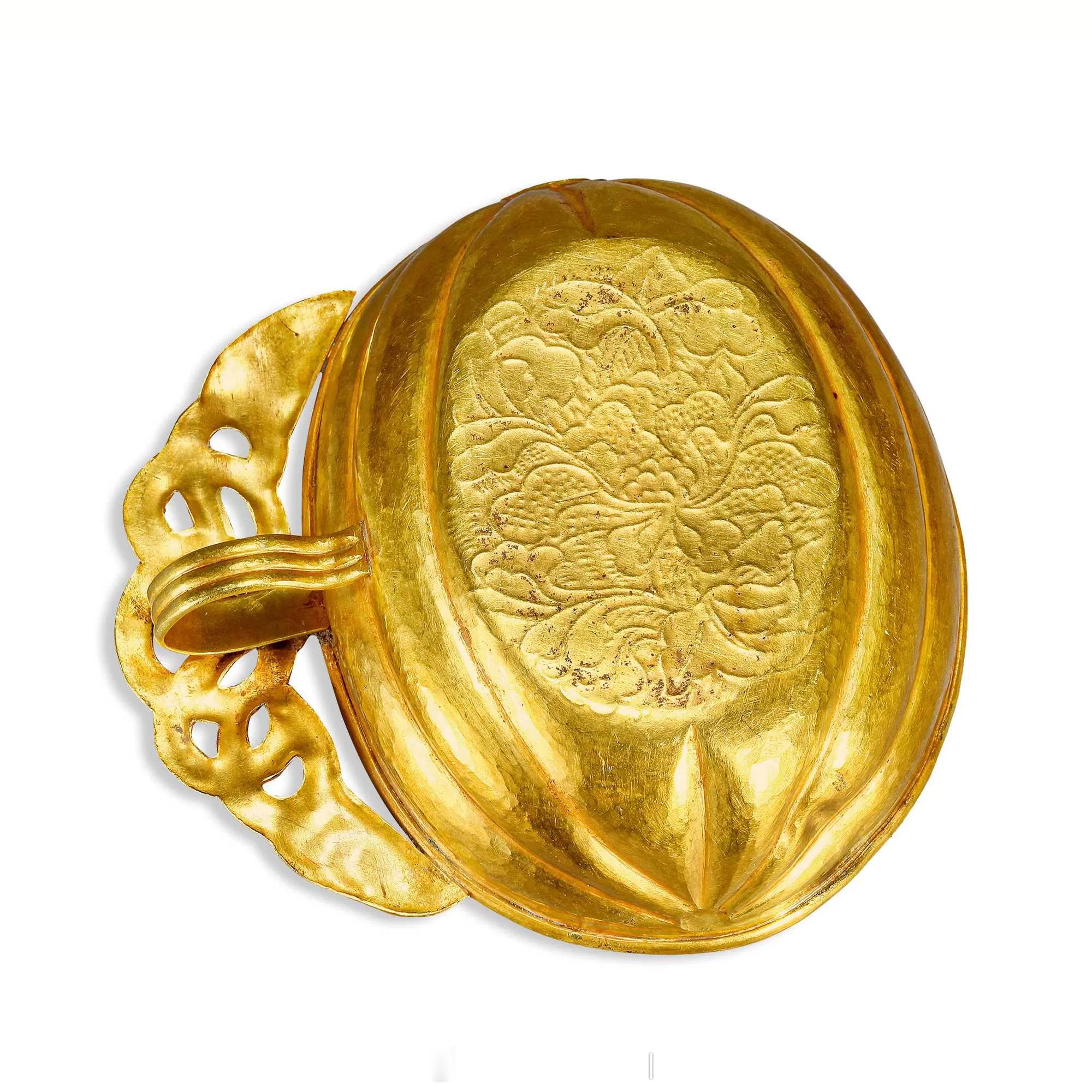 明 花卉瓜形金耳杯本品金杯呈瓜形,瓜楞六瓣,斜腹圆底。采用锤揲、錾刻等多种技法制作而成。耳杯身一侧,飘带穿插绕曲,作盘长结耳,腹部安一个环形耳,环口甚小,仅容一指。杯内底錾刻缠枝牡丹花卉纹,雍容繁茂,当为宋时权贵之用。尺寸:长20.5cm来源:保利2025秋拍《观止—瓶花落砚,醉诗梦仙》