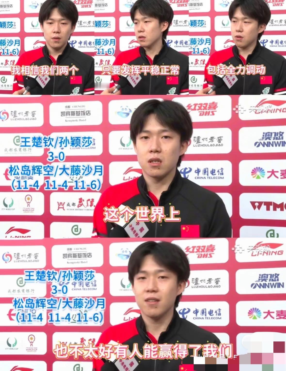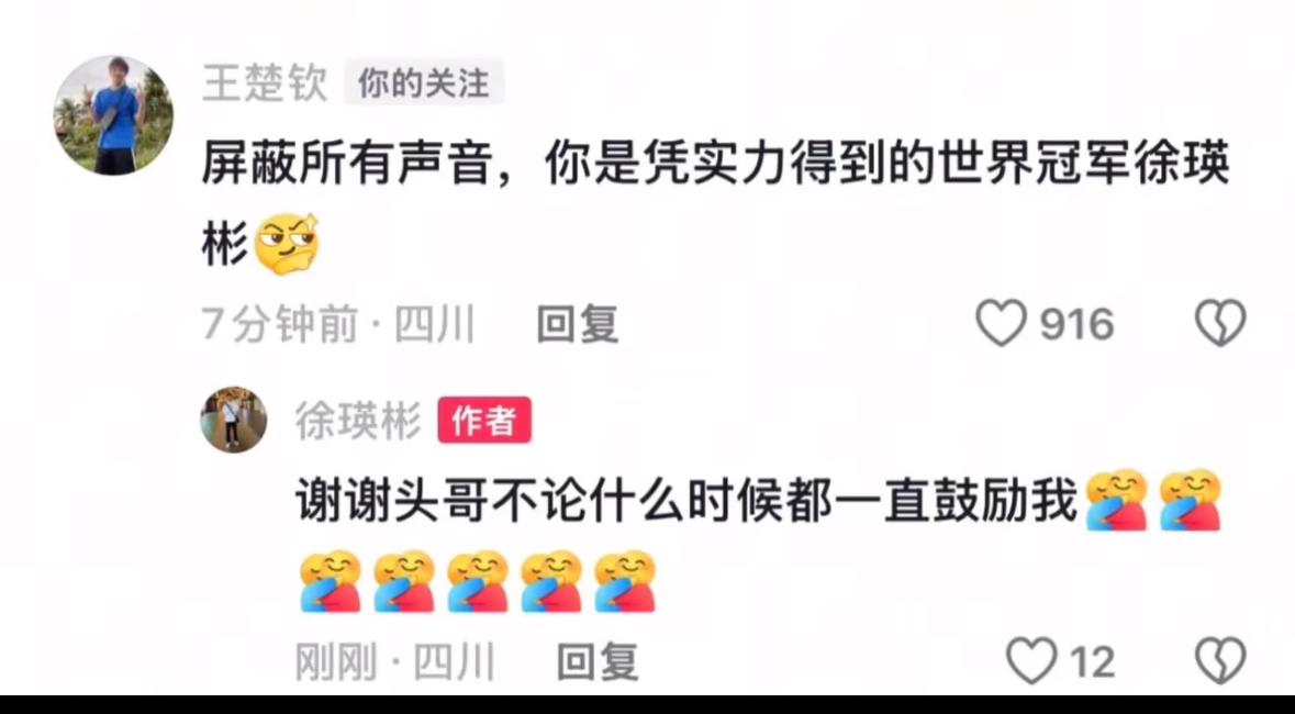 王楚钦鼓励徐瑛彬:屏蔽所有声音 你是凭实力得到的世界冠军🏆 王楚钦与徐瑛彬平台互动啦, 王楚钦永远都是 这么温暖的男孩子, 徐瑛彬: “谢谢头哥, 无论什么时候, 都一直鼓励我!” 王楚钦在队里真的太美好的存在, 场上扛起责任, 场下温暖队友, 梁靖崑,林诗栋都和王楚钦的 关系特别好, 虽然徐瑛彬在混团输了, 也是在队内竞争中获得的参赛名额, 就上一场, 还打安东, 安东不差, 输赢正常!