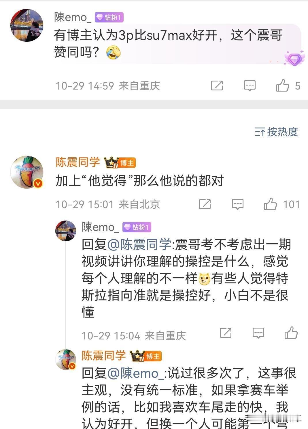 “陈震:我不承认,Model3相比Su7 配置太低了,操控方面小米SU7有纽北背书呢,Model3呢?” 这话一出,直接炸了锅。车圈这几天就没消停过,陈震这波发言,简直是往油锅里泼了瓢水,噼里啪啦全炸了。 你说他吹小米吧,还说驾驶感受主观得很;说他客观吧,又上来一句“Model3配置太低”,这不是明摆着拉偏架吗? 但你细品,他说的还真不全是虚的。 小米SU7那台车,从发布起就带着一股“不服来战”的劲儿。 24万的车,前排通风加热、后排加热、空气悬架、碳纤维尾翼,这配置堆得,确实不像个“新势力头一炮”的样子。反观特斯拉Model ,哪怕是高性能版,很多功能你还得加钱选装,座椅通风?想都别想,除非你上顶配。 更关键的是,人家SU7真去纽博格林跑了一圈,官方成绩7分39秒,虽然没进榜前十,但作为一台四门纯电轿车,能跑进八分钟以内,已经够拿得出手了。你再看Model ,别说纽北刷圈了,连正式成绩都没几个。 特斯拉这些年靠的是软件和三电系统吃饭,底盘调校? 早就不当重点搞了。说白了,它现在就是家科技公司,不是传统性能车厂。 可问题来了,好开这事儿,真能用一个圈速定生死吗? 陈震自己也说了,主观!有人喜欢硬桥硬马的支撑感,转弯像贴地飞行;有人就爱软乎舒服,过个坑不颠得脑仁疼。你说小米SU7操控强,可真开起来,它的转向手感、刹车脚感,是不是还有点“工程师调出来的味道”? 那种人车合一的沟通感,老司机一摸方向盘就知道。 而Model 3呢?别看配置不高,但它那套单踏板模式+精准转向+低重心设计,多少人一开就上瘾?尤其城市通勤,那种干脆利落的感觉,根本不用多想,车子自己就懂你要干嘛。这不是配置高低能解决的,这是多年积累的驾驶质感。 所以啊,别听谁一句话就下结论。 你说陈震偏心?可能有点。 但他也没完全瞎说。小米这次确实是下了血本,硬件上碾压同级,宣传也敢放狠话。可特斯拉赢在体系力,是生态,是全球超充网络,是自动驾驶的领先一步。两台车根本不是一个路数的打法。 现在网上吵翻天,粉丝对喷,博主站队,搞得跟饭圈掐架似的。 可咱们普通人买车,图的是啥? 是你在评论区赢了辩论,还是车能陪你风吹日晒五年八年不出大毛病? 你要追求面子、科技感、配置拉满,SU7确实香。你要图省心、补能方便、驾驶轻松,Model 3依然能打。没有谁彻底吊打谁,只有适不适合你。 这年头,车评人一句话就能引爆舆论,可他们踩过的坑、写过的稿,哪句不是带着立场的?咱们老百姓,耳朵得灵光点,脑子得清醒点。别被人牵着鼻子走,最后买了台回家后悔的车。 说到底,买车不是选偶像,不用非得分个高低上下。你喜欢的就是最好的,你觉得顺手的就是最牛的。别人嘴里的“神车”,开到你手里也可能是个累赘。 亲爱各位读者你们怎么看?欢迎在评论区留言讨论!