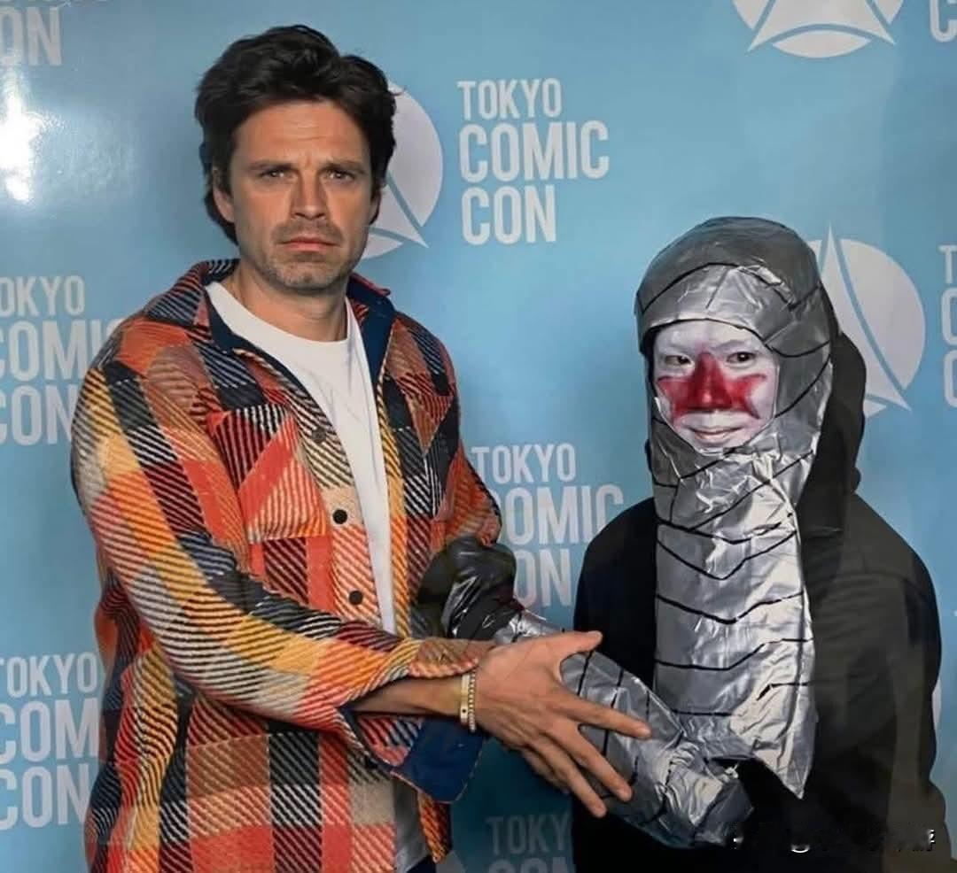塞巴斯蒂安·斯坦在东京动漫展上与一位扮成巴基手臂的狂热粉丝合影。