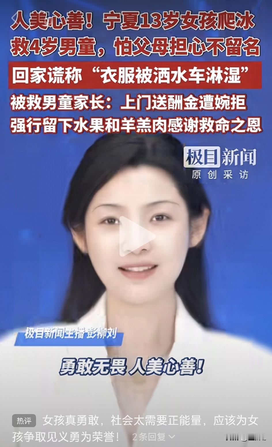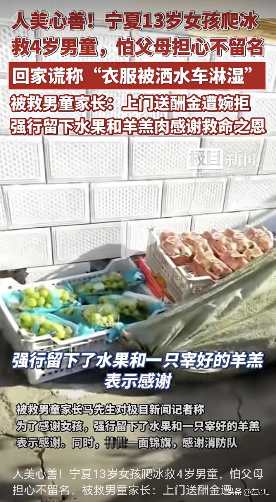 13岁小姑娘冰窟救人,回家却跟爸爸说衣服是洒水车淋湿的!被救男童家人:救命之恩大如天!学校:公开表彰!网友:又勇又暖! 近日,宁夏同心县发生揪心又暖心一幕:一名4岁男孩不慎掉入结冰湖面的冰窟,危急时刻,一名路过的女孩毫不犹豫爬过去救人,结果自己也落水了。万幸,消防员及时赶到,将两人都救了起来。 上岸后,女孩披着毯子悄悄离开,连名字都没留。而她回家后,怕爸妈担心,只轻描淡写地说了句:“衣服被洒水车淋湿了。” 这位女孩,就是同心县第二中学的初一学生李佳婷,今年才13岁。 事情发生在12月6日下午。李佳婷放学回家路过人工湖,看到几个小孩想在冰面上玩,她赶紧上前劝阻,说冰薄危险。 话音刚落,就听到有人呼救——一个小男孩掉进了冰窟窿。 “看到那个小弟弟的眼神,就是在向我求救。”虽然自己也不会游泳,但李佳婷觉得“我身体轻”,就拿着路人递来的管子,趴在冰面上爬过去想拉孩子。 没想到管子刚递到男孩手里,她脚下的冰也碎了,整个人掉进冰冷刺骨的湖水里,水一下子淹到了脖子。 “当时真的很冷,也很害怕。”她说。幸好,周围大人和及时赶到的消防员把她和男孩先后救了上来。 惊魂未定的小姑娘,上岸后第一反应是:千万别让爸妈知道,他们会担心的。于是她默默离开,并对家人撒了个“洒水车”的谎。 直到当晚,李佳婷的爸爸李晓辉在网上看到救人视频,才震惊地发现:那个勇敢又狼狈的小英雄,竟是自己的女儿。 “又后怕又心疼,但也特别欣慰。”李爸爸说。他郑重地提醒女儿:以后救人,一定要先保证自己的安全。 第二天,被救男孩的家长带着十几位亲友,和学校领导老师一起登门感谢。他们提来了水果、一只宰好的羊羔,还有酬金。 “这钱绝对不能收,东西也不该收的。”李爸爸一再婉拒。 但男孩家长执意将水果和羊羔留下:“东西不值钱,但孩子的救命之恩,比什么都重。” 面对大家的赞扬和关怀,一直“后怕”的李佳婷终于笑了。 她说,自己只是做了件顺手的事,以后遇到类似情况,还会想办法帮忙,但会更注意方式,比如大声呼救、赶紧报警。 同心县第二中学马校长表示,将在周一升旗仪式上公开表彰李佳婷,并争取为她申报见义勇为荣誉。 一个13岁的女孩,在危险面前选择了勇敢,在赞誉面前选择了低调。这份善良与担当,让这个冬天格外温暖。 信息来源于极目新闻,侵联删!