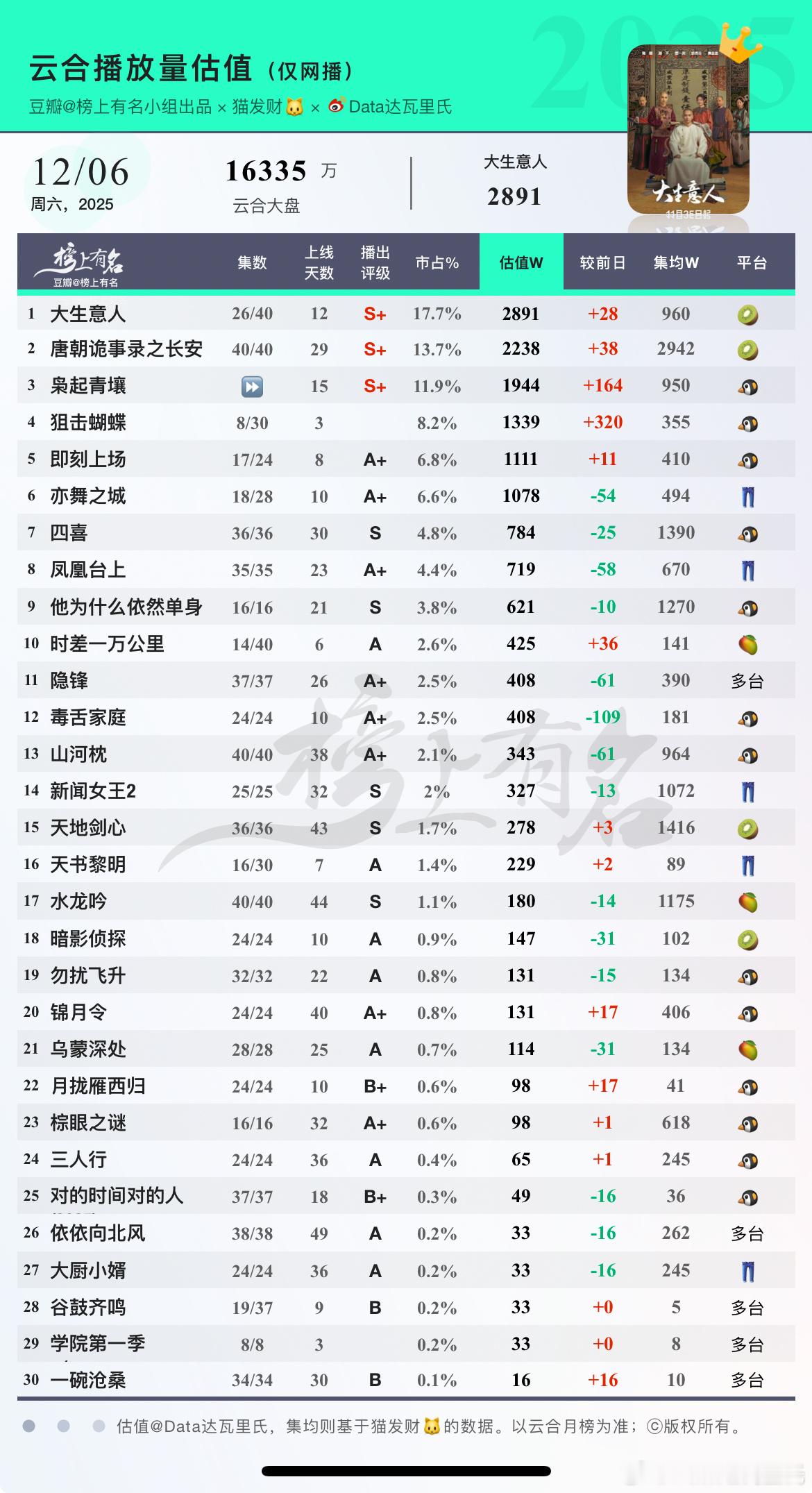 12.6云合估值🌴豆瓣榜上有名小组出品1 大生意人 +28 2 唐朝诡事录之长安 +38 周末微涨了点3 枭起青壤 ⏩ 超点完结 +164 集均950万4 狙击蝴蝶 第三天 +320 5 即刻上场 +11 6 亦舞之城 -54 7 四喜 -25 8 凤凰台上 -58 9 他为什么依然单身 -10 10 时差一万公里 +36 11 隐锋 12 毒舌家庭 13 山河枕 14 新闻女王2 15 天地剑心 16 天书黎明 17 水龙吟 18 暗影侦探 19 勿扰飞升 20 锦月令 狙击蝴蝶热度,大生意人数据 ,枭起青壤数据 狙击蝴蝶热度