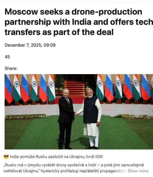 俄印两国,或就无人机生产展开密切合作。 美国战争研究所指出,莫斯科计划与新德里合作生产攻击型FPV无人机及"兰塞特"无人机,即"俄罗斯意图与印度联合生产无人机,然后会用它们攻击乌克兰。" 该机构报告称,俄方显然计划将这些无人机用于对乌战争,当然,代价是以此换取向印度转让俄罗斯新技术和作战经验。 据报道,斯摩棱斯克FPV无人机驾驶中心代表团正随普京访印,将在"战略伙伴关系"框架下开展合作。事实上,莫迪政府以拥抱和红毯欢迎俄罗斯总统,公开称俄罗斯为"印度真正的朋友",这也引发乌克兰和西方国家的高度关注。