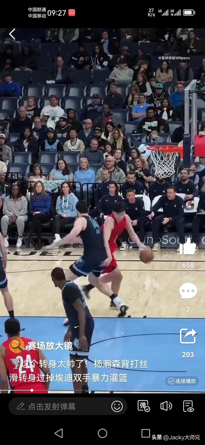 生涯里程碑,背打周志豪,杨瀚森 直接双手灌篮,拿下首发的首分! 今天打灰熊,杨瀚森个人生涯里程碑,首次首发出场,开场后他不适应节奏并被周志豪连续上课,防不住并且抢不到篮板,早早两次犯规。 但是下半场调整了心态,也打出了自己的特点,给队友的掩护质量不错,还有助攻,空位不投三分,改成策应,其中一次直接助攻西索科暴扣。 还有两次单打周志豪得手,是很大的亮点。 再接再厉,继续加油!