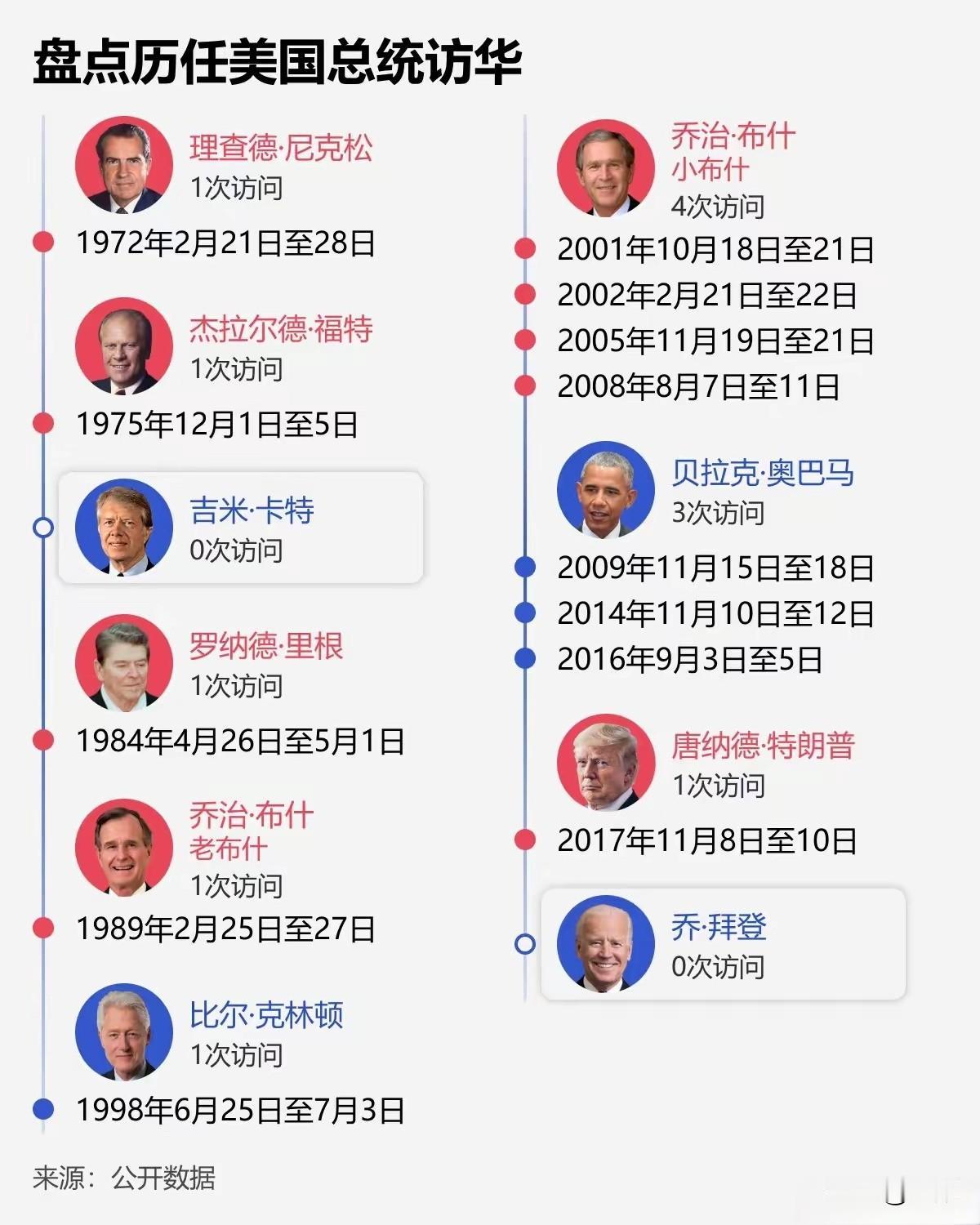 1972年尼克松开启访华“破冰之旅”,成为首位访华的美国总统; 乔治·布什(小布什)以4次访华次数成为历任中访华最多的总统; 奥巴马访华3次,福特、里根、老布什、克林顿、特朗普各访华1次; 卡特、拜登暂无访华记录。 1972年2月尼克松访华,原本配备的翻译是冀朝铸,因尼克松看重女翻译的公众形象,章含之受命陪同其夫妇外出翻译,故宫、长城、西湖等参观行程中都有她的身影。翻译途中不乏趣味小插曲,上海锦江饭店行程里,尼克松提及“十七万英里”国土航程,章含之误译为“七千英里”,经周恩来总理提醒后及时更正;人民大会堂内,尼克松当众夸赞她“我得为我这位中国声音举杯,她挑不出错”,害羞的章含之一时卡顿,最终由唐闻生补译完成。