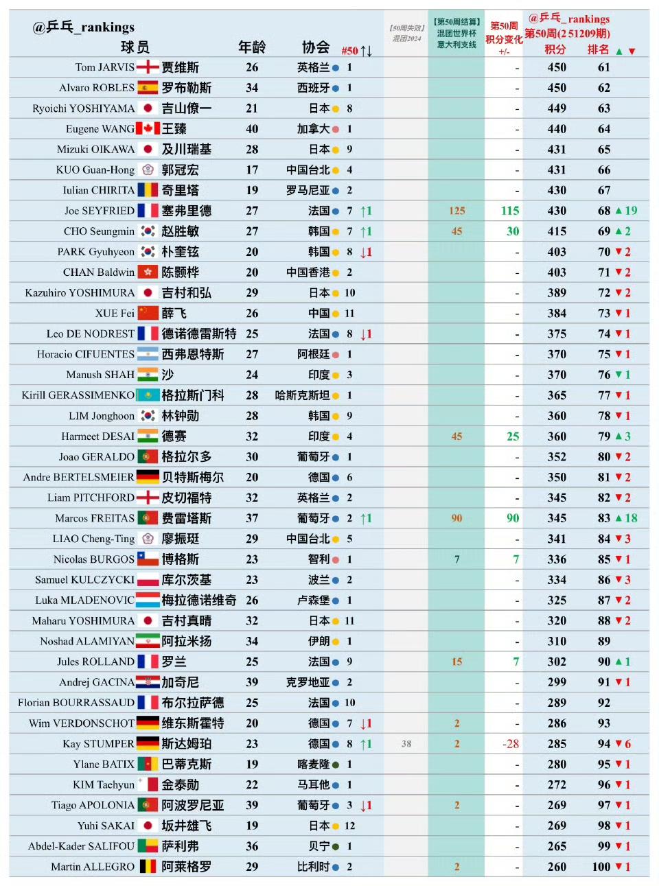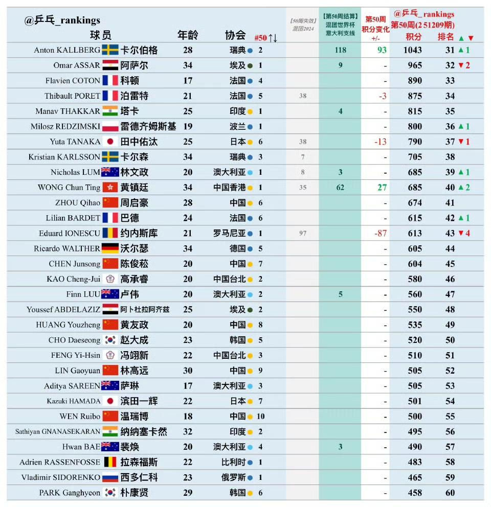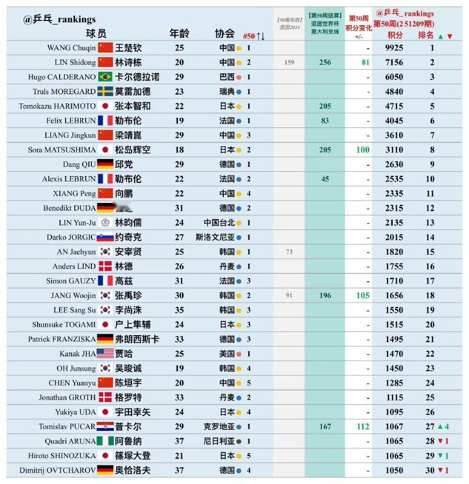 国际乒联2025第50周男单项目世界排名! 本周世界排名积分增加了2025成都国际乒联混团世界杯的成绩积分,虽然成都混团比赛是团体比赛,但夺冠队伍可以获得2500的积分,其他排名的队伍也有相应积分获得,这些积分将根据队员的比赛胜场份额分配给他们。 当然,球员的比赛单项占比需要至少达到球队总和的10%才能获得积分,也就是说出场次数多了得分就多。 国乒选手的排名没有大的变化,大头和石头稳居前二,大胖排在第七位,向鹏排在第11位。 日本选手松岛辉空排在了邱党的前面,在第八位,今年才18岁,在日本男线上排在第二位,明年松岛少爷大概率就是日本一哥了。 安东·卡尔伯格🇸🇪和普卡🇭🇷在成都混团加的分真是值了,安东上升一个位次来到第31位,克罗地亚名将普卡上升一个位次来到91位。 (感谢rankings的图片)