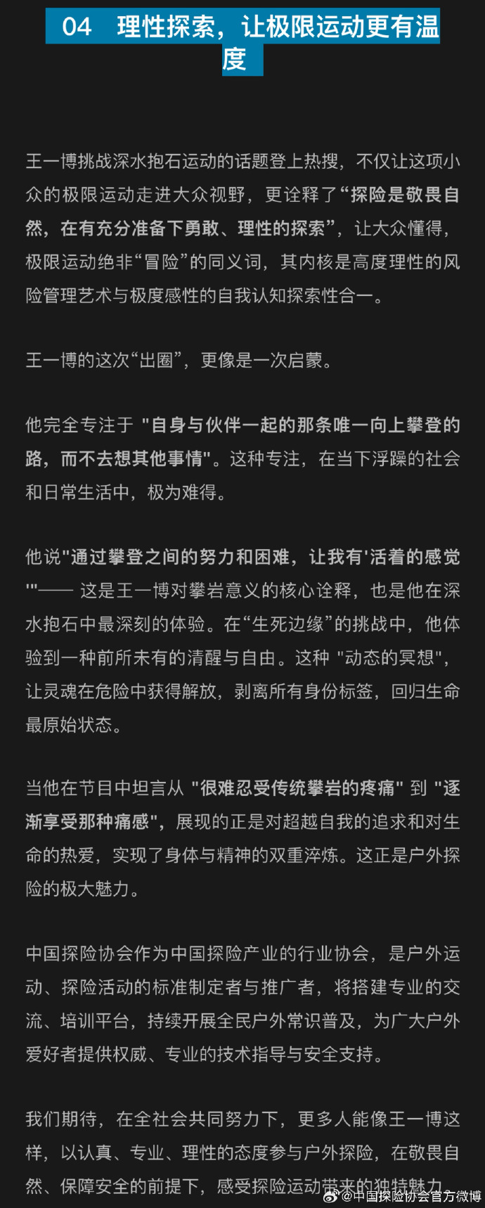 【中国探险协会:攀岩中王一博剥离了所有身份标签】中国探险协会评王一博回归生命原始状态王一博徒手攀手滑掉海里了 一事引发热议,称,我们看到的,不仅是“深水抱石”这项小众、极限攀岩形式 “出圈”,走进大众视野,更有"很难忍受传统攀岩的疼痛" 到 "逐渐享受那种痛感",表达了对超越自我的追求和对生命的热爱,实现了身体与精神的双重淬炼——这些正是户外探险的极大魅力。