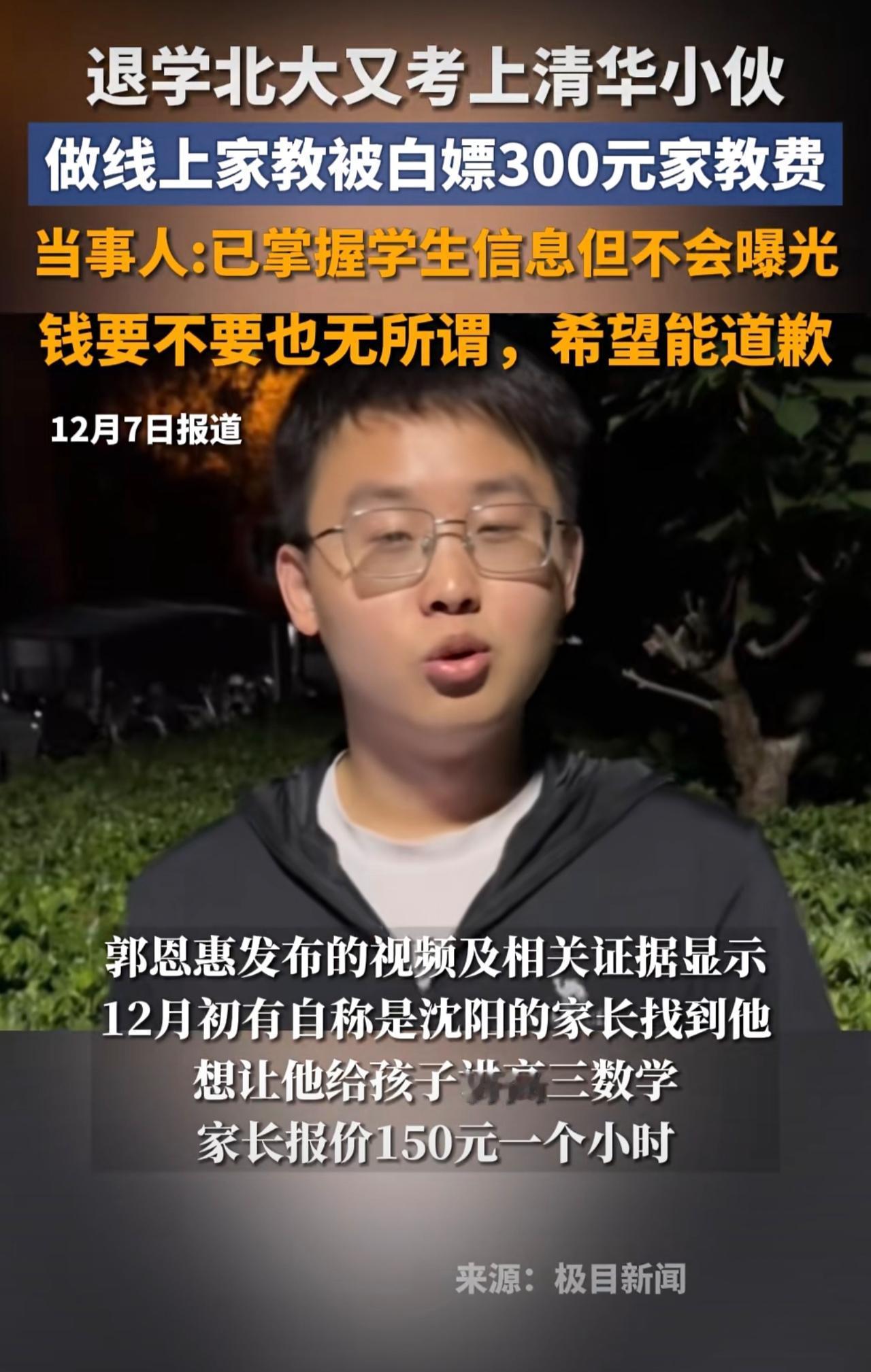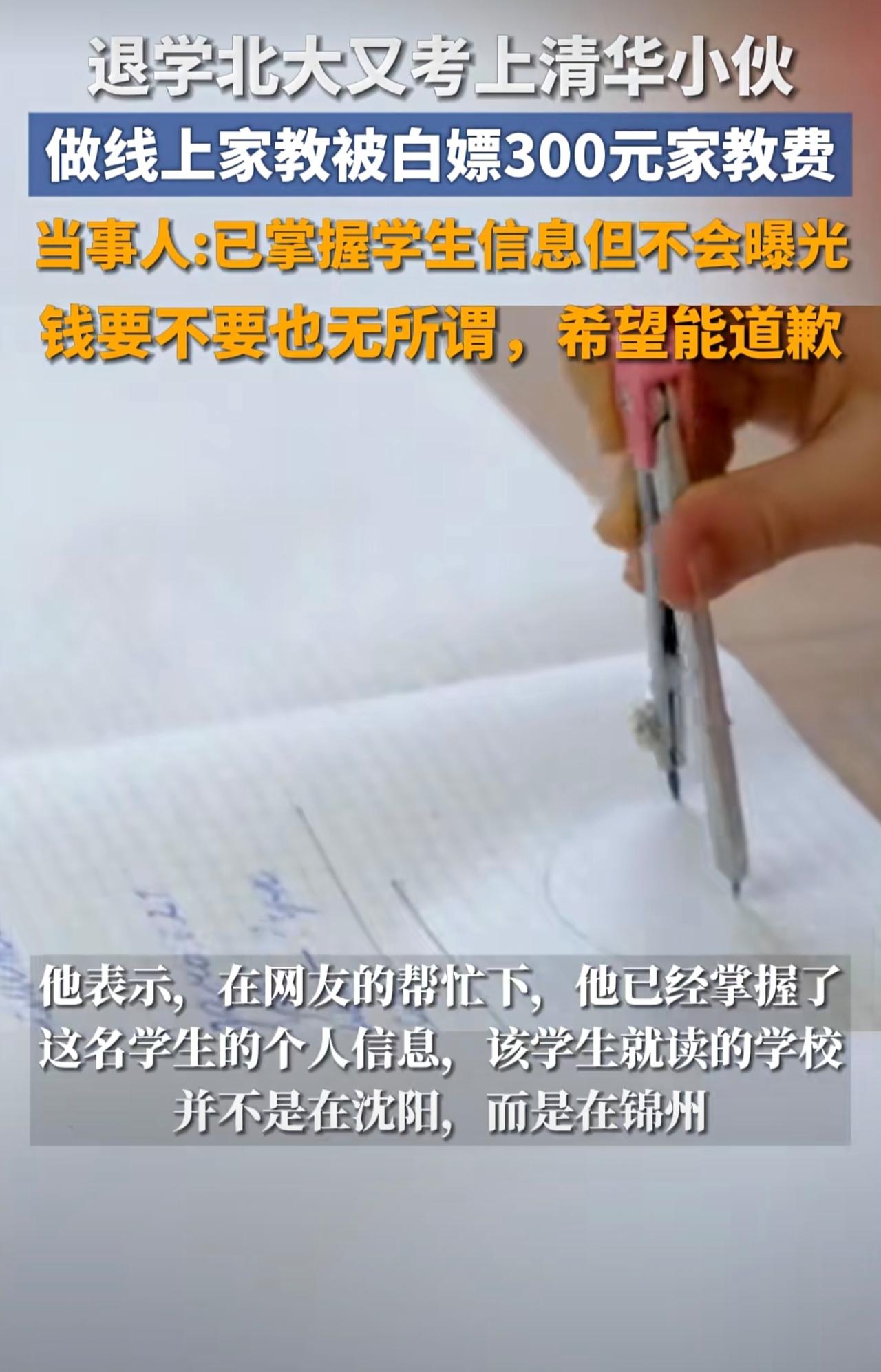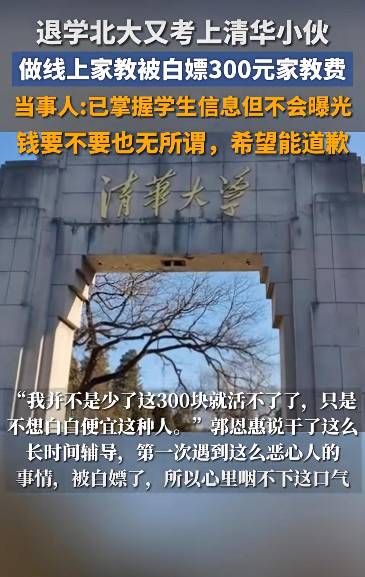 退学北大又考上清华小伙被白嫖300元家教费,当事人:已掌握学生信息但不会曝光,钱要不要也无所谓,希望他和家长能向我道歉。