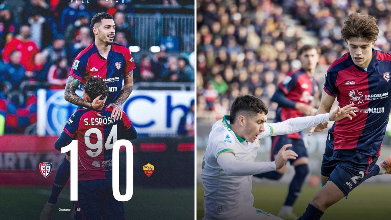 意甲:十人罗马0-1负于卡利亚里,27分排名联赛第4位。 切利克直红,盖塔诺打入制胜进球。
