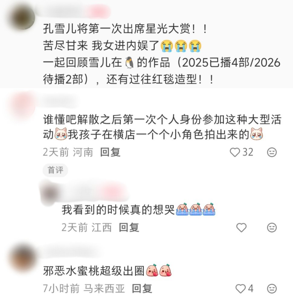 孔雪儿首次出席星光大赏 孔雪儿官宣星光大赏!没想到出道这么多年竟然是第一次参加,雪儿25年播了五部剧,邪恶水蜜桃大出圈,这真的算是有效播剧了吧!在横店兢兢业业拍戏的小女孩终于越来越好了 孔雪儿有效播剧