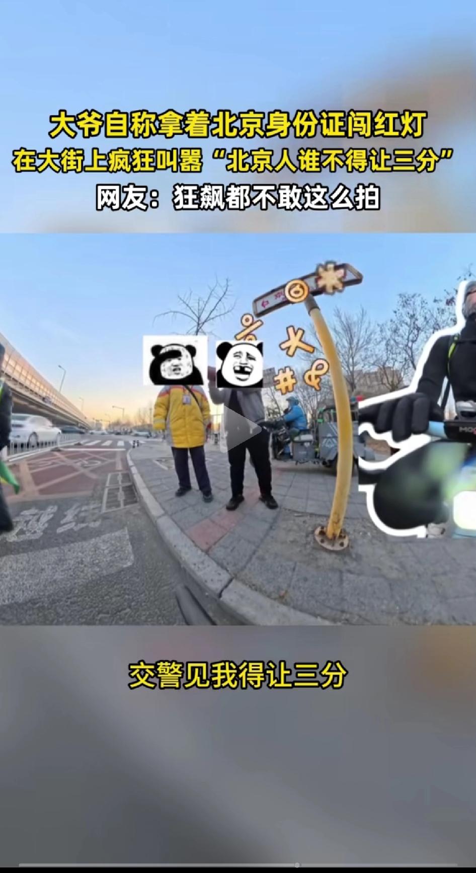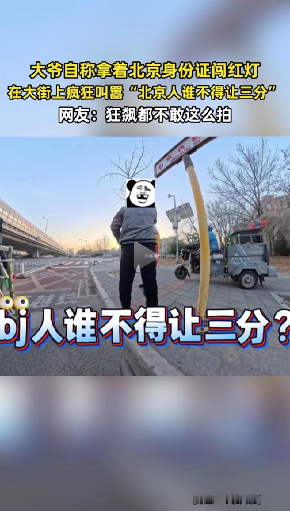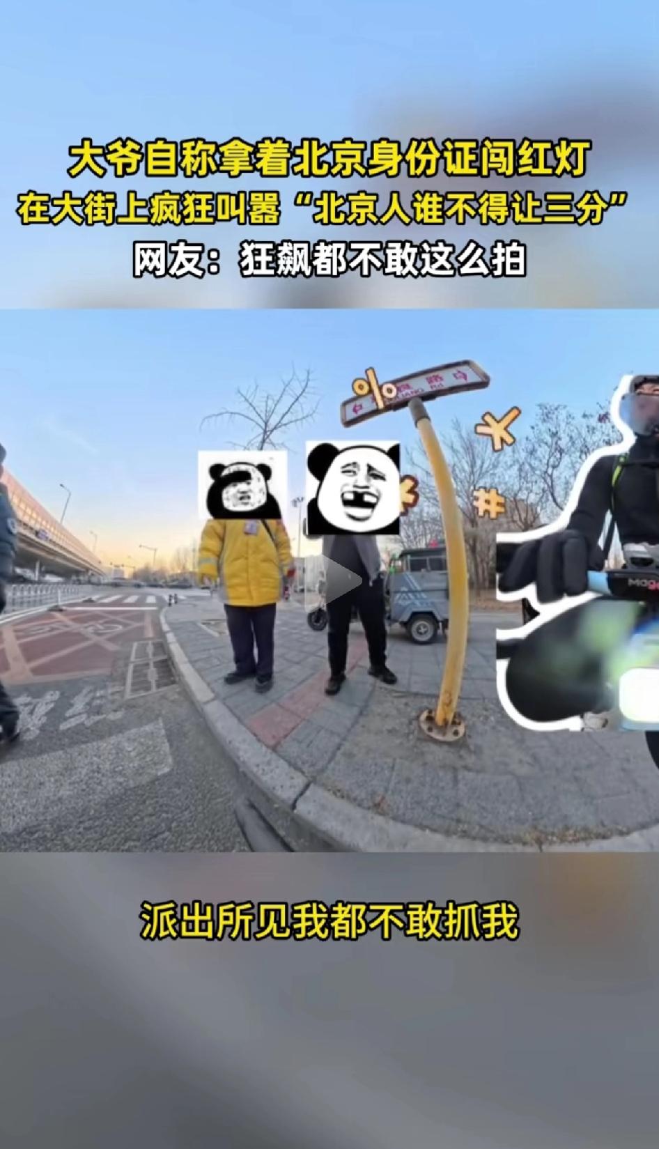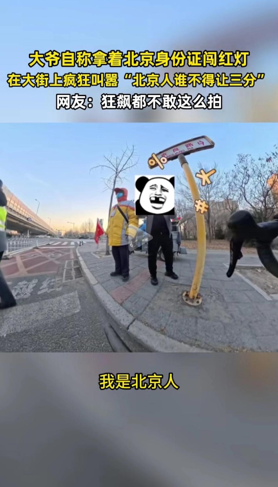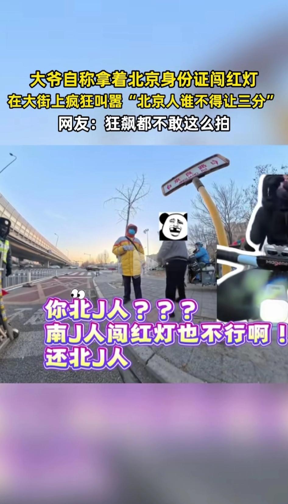 我是北京人,犯了法派出所都不敢管我。 大爷自称拿着“北京身份证”闯红灯都不犯法。 这大爷一口一个我是北京人,我有北京身份证,在大街上疯狂叫嚣,北京人谁见了不得让三分。 这个号称北京人的大爷,闯红绿灯,被人工作人员劝阻。 大爷中气十足的叫嚣,自己拿着北京身份证呐,闯红绿灯也不犯法,交警见了也不敢管自己。 别说闯红绿灯了,自己手拿北京身份证,就是犯了法派出所见了自己也不敢抓。 几分钟的视频里,只听见大爷嘴里一口一个我是北京人,我拿着身份证呐。 路人听不下去回了他一句:你北京人?南京人闯红绿灯也不行,还北京人。 网友:狂飙都不敢这么拍! 这大爷的行为,真给北京人脸上抹黑。 虽然我没去过北京,但听说真正的北京人很有素质的。 绝不会像这个大爷一样,拿着北京身份证给北京人脸上抹黑。 那个北京身份证,比上海人还有优越感。 上海人的优越感绝对是在法律范围之内的,绝对不会触犯法律。 这大爷拿的哪是北京身份证,明明拿的是尚方宝剑[笑哭][笑哭][笑哭]
