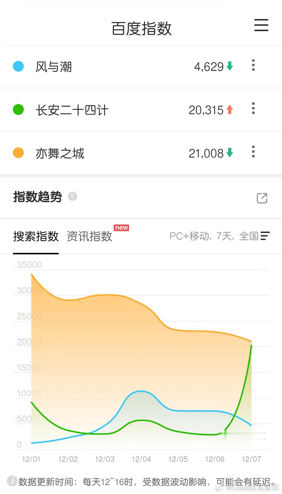 12.7播前百指任嘉伦风与潮 4629,10城有异常(沧州、唐山)成毅长安二十四计 20315,和风与潮第5都是南京但无明显实锤……如果十城是正常的,那还可以