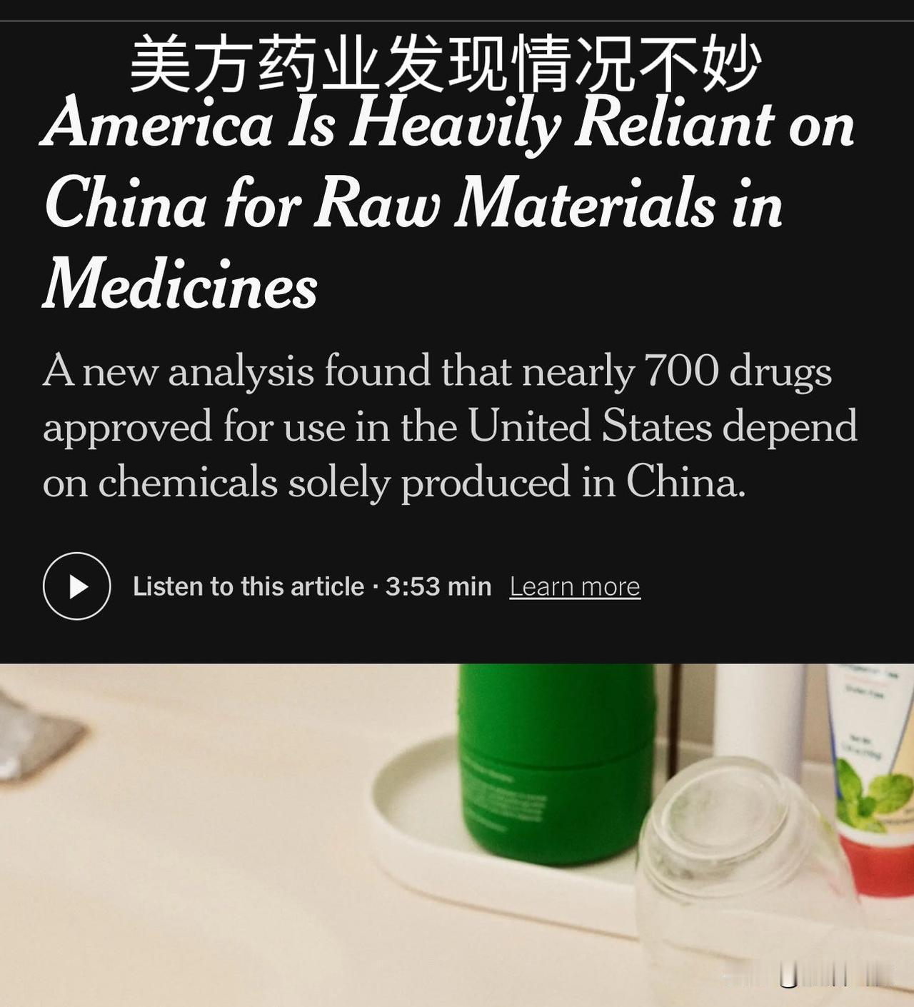 原来稀土根本不算什么——最厉害的牌我们根本没打出去,但一直亮着明牌。 真正让美国提心吊胆的,其实不是稀土而是美国制药行业所需的化学前体——也就是合成药物过程中必不可少的中间化学品。 美国医药原料药依赖程度:美国药品委员会估计,25%至50%的仿制药原料药(API)依赖中国关键原料(直接或间接)。而美国布鲁金斯学会指出,原料药的这一比例约为25%。700种处方药,需要只是一种来自我们的原料。 王炸就摆在他们面前,出不出完全看他们的表现。震慑力max,所以美国很快就和我们谈好了。