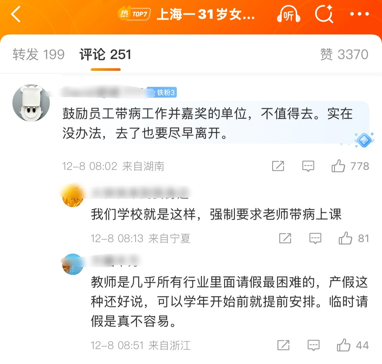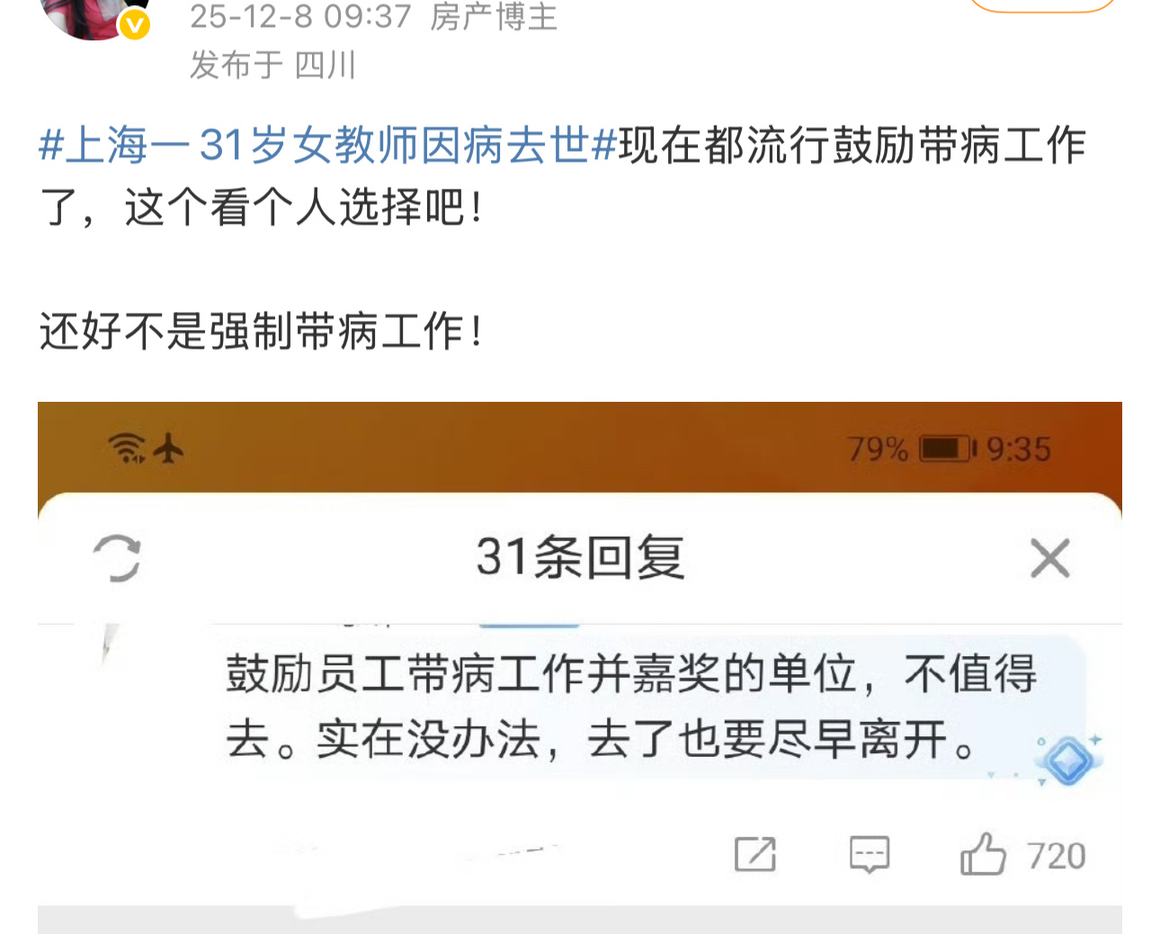 就因为原文里面提到过一句:今年5月,她刚获得教育局给予的行政奖励嘉奖。就被人解读成鼓励员工带病工作并嘉奖的单位,不值得去。这世界怎么变成这么颠了?另外,我其实看不懂这样的新闻为什么会变成媒体的关注点(没有质疑老师去世的意思),每天因病去世的年轻人,也不少吧,为什么偏偏这位老师让极目新闻的小编关注到了?上海一31岁女教师因病去世热点观点 上海一31岁女教师因病去世