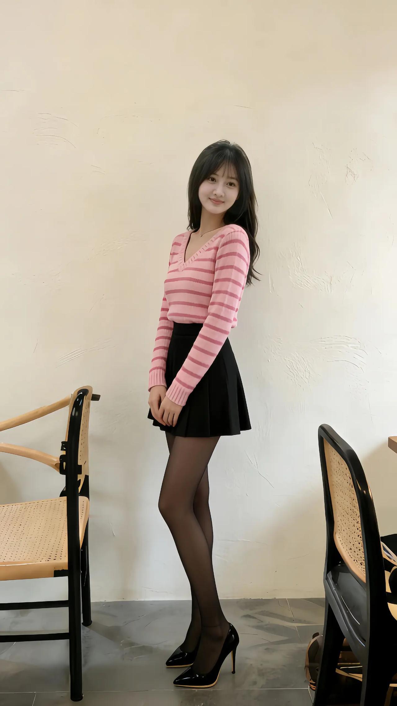 优雅气质穿搭,粉色条纹毛衣搭配黑色短裙,尽显时尚魅力!