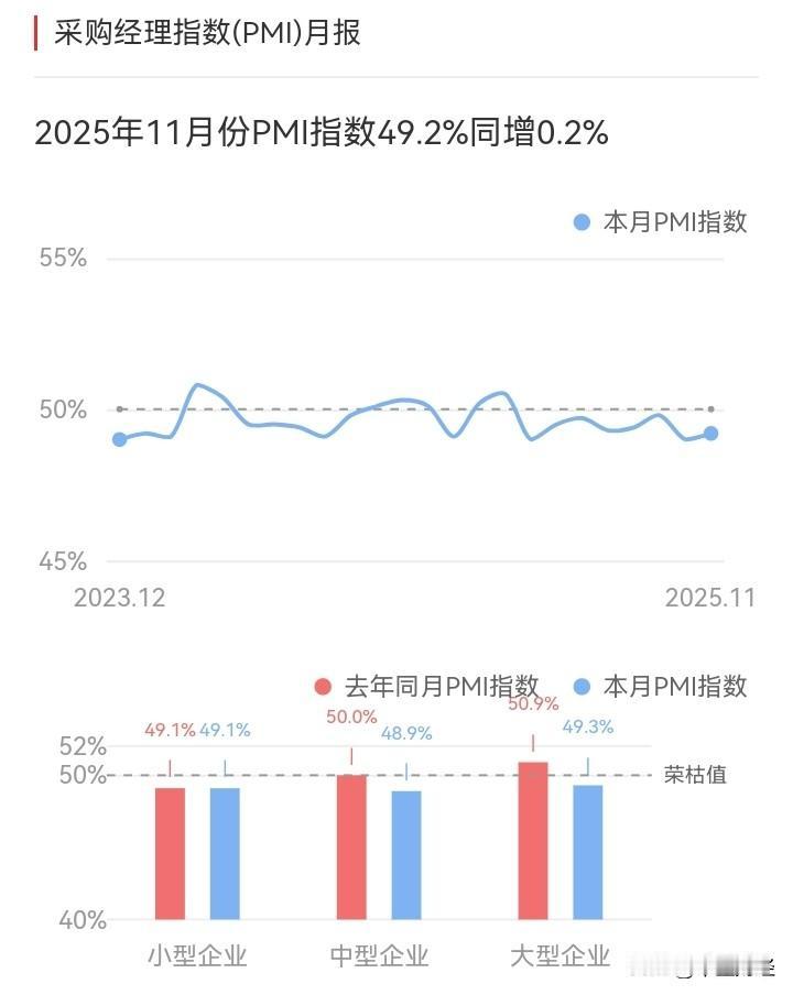 PMI连续8个月处于荣枯线下方,经济形势确实严峻。就拿11月来说,制造业PMI为49.2%,虽较上月回升0.2个百分点,但仍在荣枯线下。非制造业商务活动指数和综合PMI产出指数也不太乐观,企业扩张步伐放缓。 不过,也有积极信号。生产指数重返临界点以上,新订单指数显示市场需求回暖,农副食品加工等行业产需活跃。另外,国际贸易方面,2025年中美贸易摩擦虽进入“休战期”,但关税博弈常态化,中国经济得靠“内循环”定力与“外循环”韧性突围,A股产业链估值逻辑也在重构。经济恢复基础还得加把劲巩固。