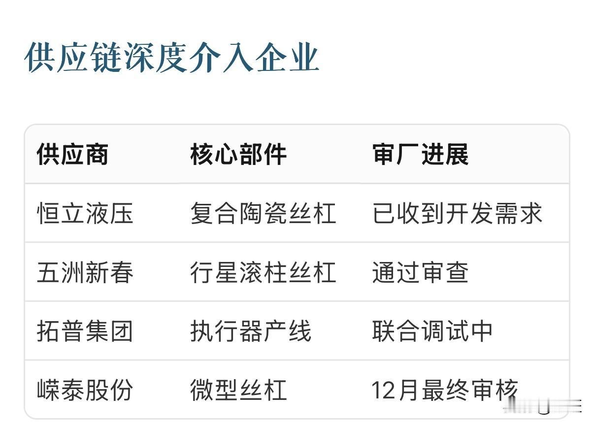 大A机器人概念盘点,特斯卡审厂了! 12月7-13日,特斯拉正在中国进行Optimus三代机器人的关键定型审厂,涉及常州恒立液压、杭州新剑、宁波拓普等核心供应商,标志着量产前最后冲刺阶段。 审厂时间线与关键节点, 12月7日:考察常州恒立液压,确认复合陶瓷丝杠开发需求 12月8日:审核杭州新剑(五洲新春关联),行星滚柱丝杠量产能力 12月9日:宁波拓普联合调试机器人执行器产线 12月中旬:嵘泰股份润孚动力工厂最终审核 12月底:首批1000根丝杠样品交付。 特斯拉已明确分阶段产能规划:上海工厂2026年10万台/年,2027年扩至50万台/年;弗里蒙特工厂2026年100万台/年,长期目标千万台级别。成本控制在2万美元以内的关键,在于中国供应链的精密制造能力与规模化优势。 特斯拉机器人 人形机器人G1 特斯拉审厂