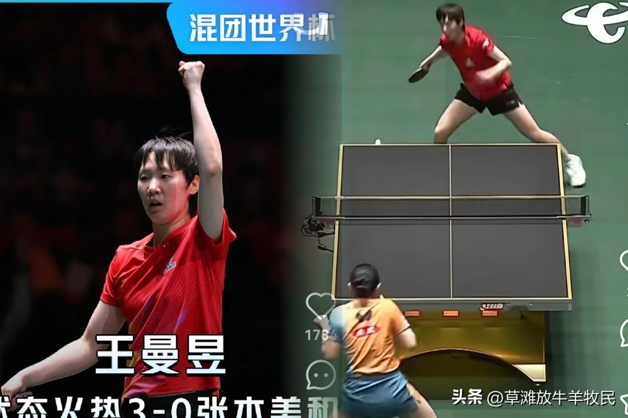 今晚,王曼昱以3-0战胜张本美和。曼昱的状态和精神状态都很好。先不说张本美和,我就说王曼昱。曼昱本场比赛是带伤上阵,脚踝处伤筋动骨了,扭到了,贴了膏药。上场比赛也是带伤,这场又是这场,真是拼命三郎啊!但曼昱上场比赛状态很好,这场比赛状态更好。全场比赛前三板得分率超60%,正手进攻得分率稳稳地保持在75%以上,发球得分率也有个30%+,完全压制住了张本美和。整场比赛节奏完全掌控在曼昱自己手里,丝毫没给对手翻盘的机会。张本美和本场比赛失误率高达28%。王曼昱赢的不仅仅是比赛,更是体育精神,不服输精神的诠释!获得了王励勤的认可,全场观众为她热烈鼓掌!