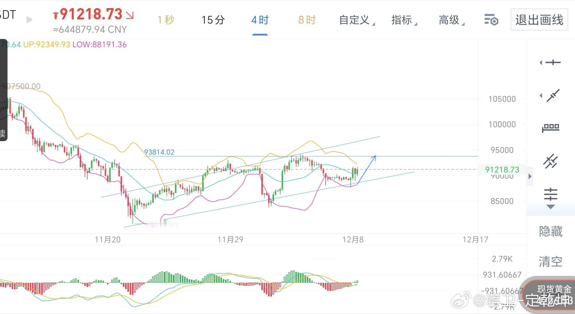 区块链 12.8btc行情解析大饼昨日回撤持续早盘冲高,多头强势上涨,上方通道打开,可能走延续,四小时节奏价格突破中上轨运行,附图指标macd多头放量。后期要继续上涨信号日内回撤90500-90000区域看涨,目标看向94000即可