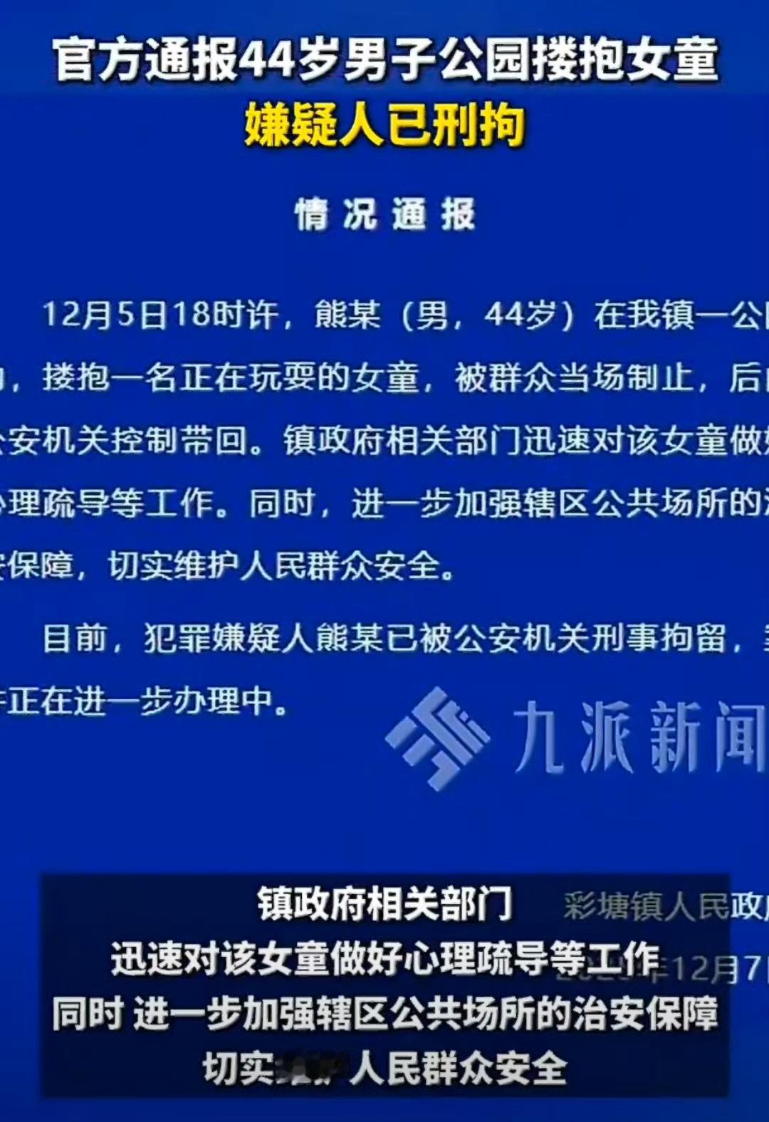警方通报44岁男子公园搂抱女童,是搂抱还是耍流氓明眼人一看便知! 44岁熊某在潮州市彩塘镇一公园内突然搂抱一名玩耍女童,女童奋力挣脱并尖叫,现场群众迅速制止并围堵熊某,随后公安机关将其控制带走。 镇政府立即对女童启动心理疏导,并加强公共场所治安巡查,目前熊某因涉嫌刑事犯罪被刑拘,案件仍在侦办。 既然通报里都是刑事拘留了,不懂为何通报里要用“楼抱”的字眼?看了视频就是在耍流氓,用词要准确,决定性质以及严不严重! 群众的果断制止太关键了!面对公园里的异常举动,路人没有袖手旁观,及时阻止了可能发生的更严重伤害,为孩子筑起了一道 “安全防线”。这种对侵害行为 “零容忍” 的态度,值得每个人学习。
