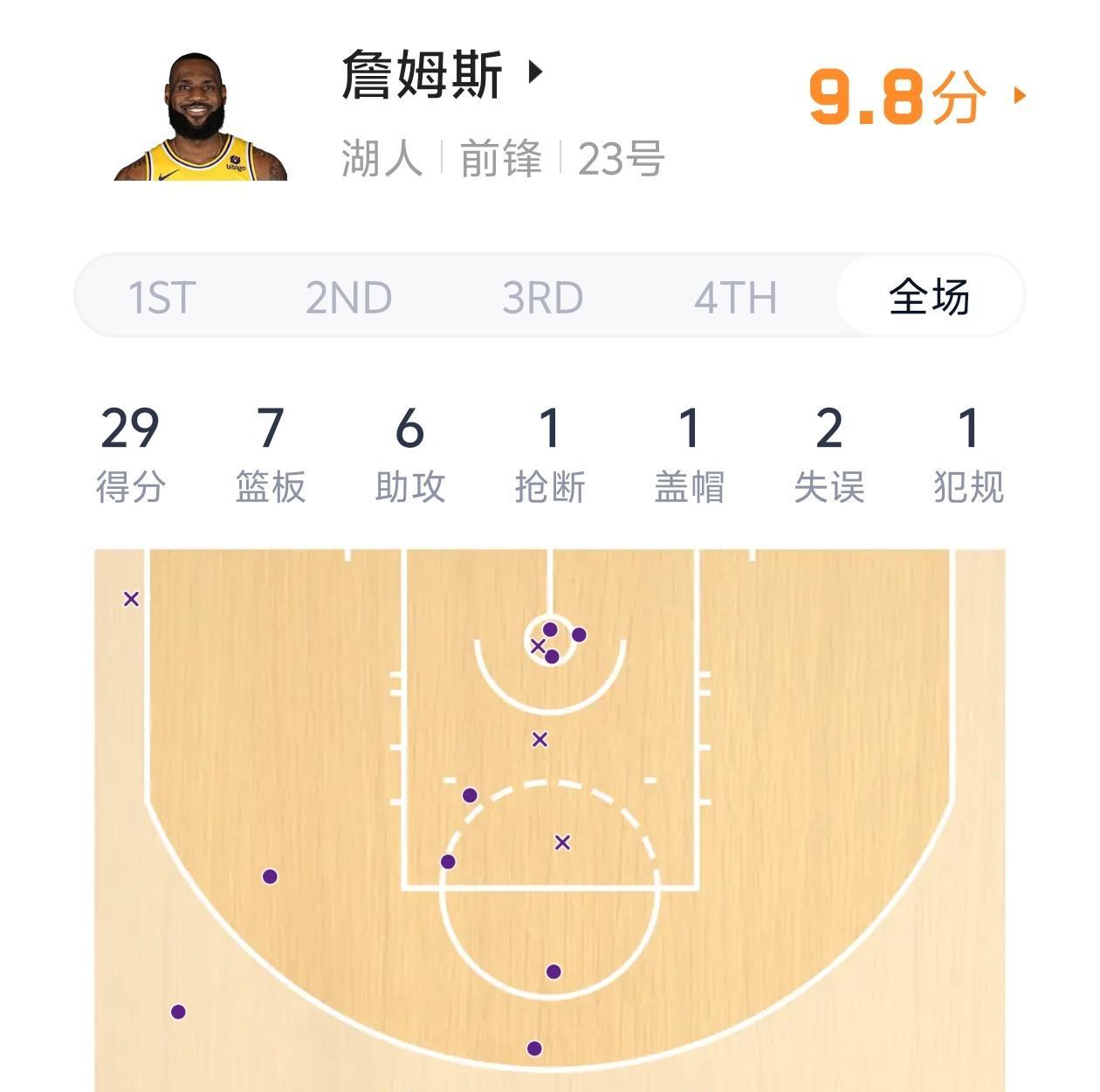评分9.8!詹姆斯打出本赛季最佳表现! 詹姆斯在对阵76人比赛中打出了本赛季最佳表现,球迷在赛后也非常公正的给出了9.8的高分。 詹姆斯是湖人赢球的大功臣,他在末节发力独得12分3篮板3助攻1抢断,在攻防两端都有出色的表现,正因为他在最后时刻的爆发,湖人才赢得了比赛。 詹姆斯全场投篮17中12,其中三分球6中4,得到赛季新高的29分,外加7篮板6助攻1抢断1封盖,詹姆斯的进攻效率相比之前有大幅提升,同时他依旧非常全面!