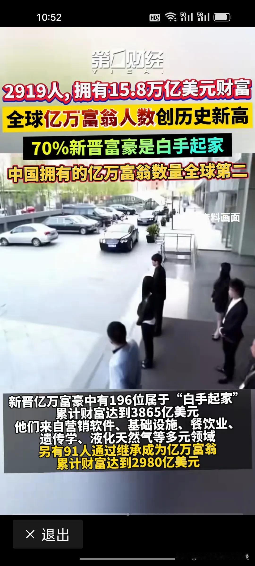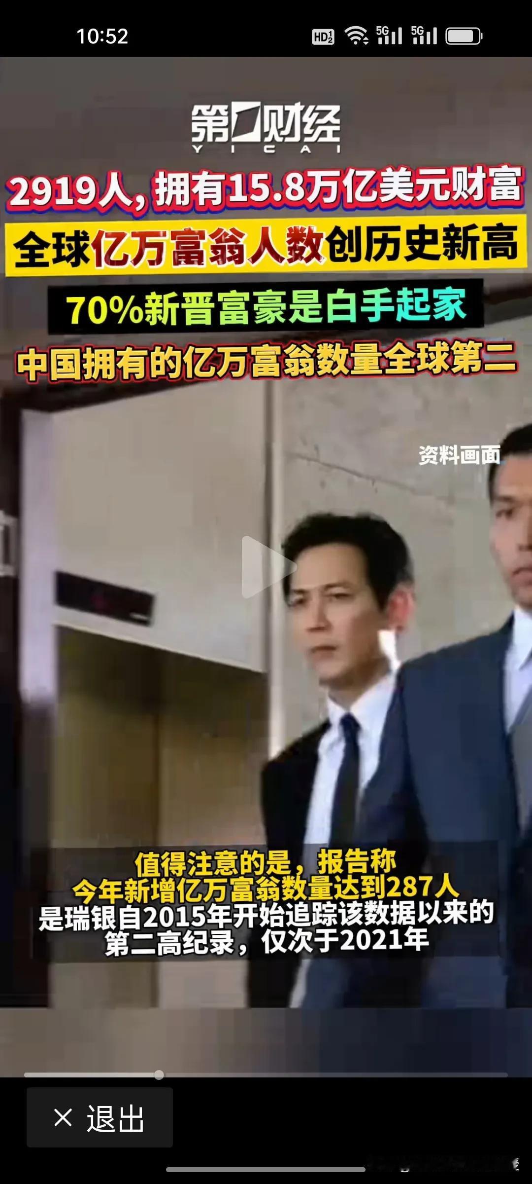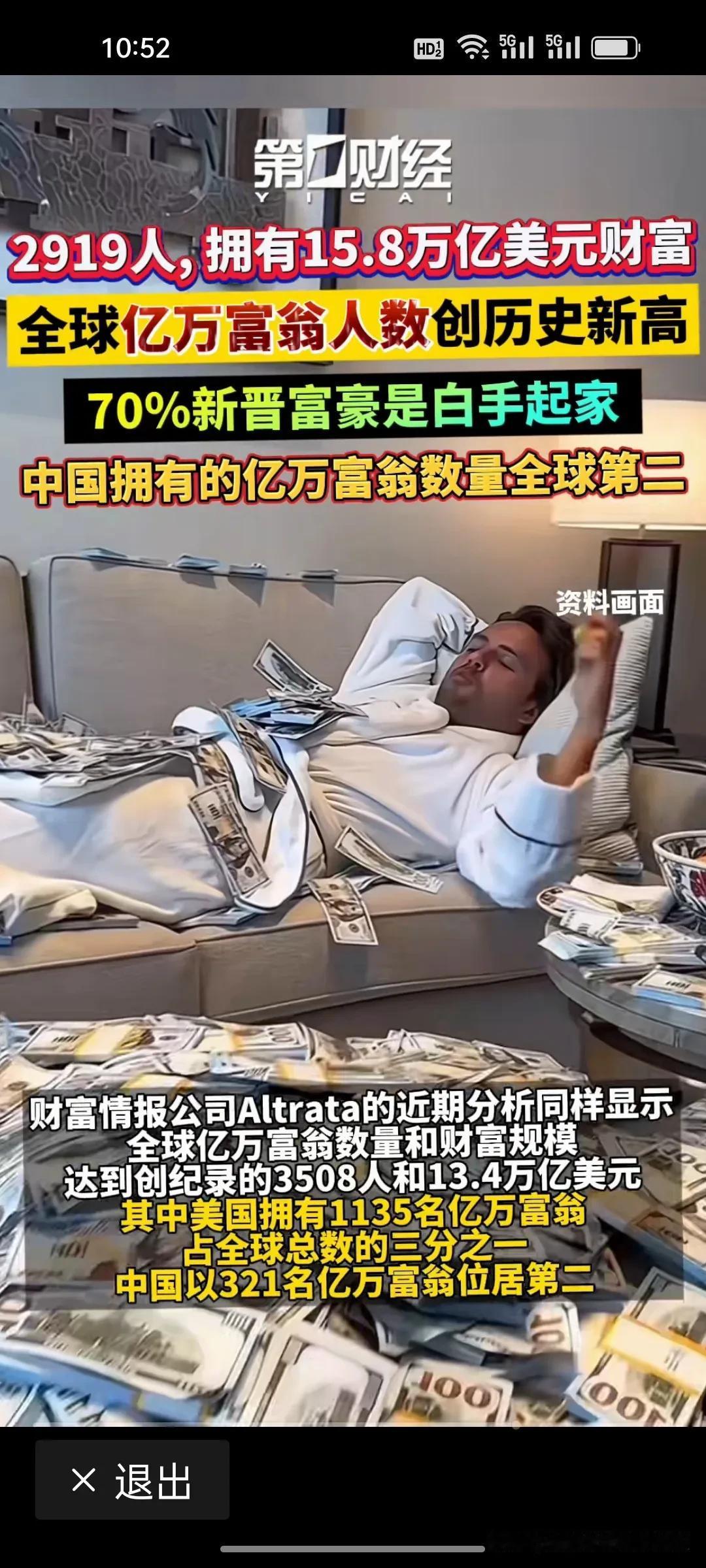 中国目前有321名亿万富豪,排全球第二! 根据《第一财经》报道,刚刚根据瑞银公布一份有关全球亿万富豪的报告,其中提到,全球有2919名亿万富豪,拥有15.8万亿美元财富,较去年增长13%,70%是白手起家。美国1135名亿万富翁,中国321名,财富增长主要因素是全球股市的上涨和科技公司估值飙升。 很多网友认为中国的这个数字少了,因为只是统计了上市公司的,很多企业没上市的,要算上没上市的企业以及一些隐形富豪,中国亿万富豪人数肯定是世界第一。不过,瑞银统计的亿万富豪指的是财富大于等于10亿美元的富豪。