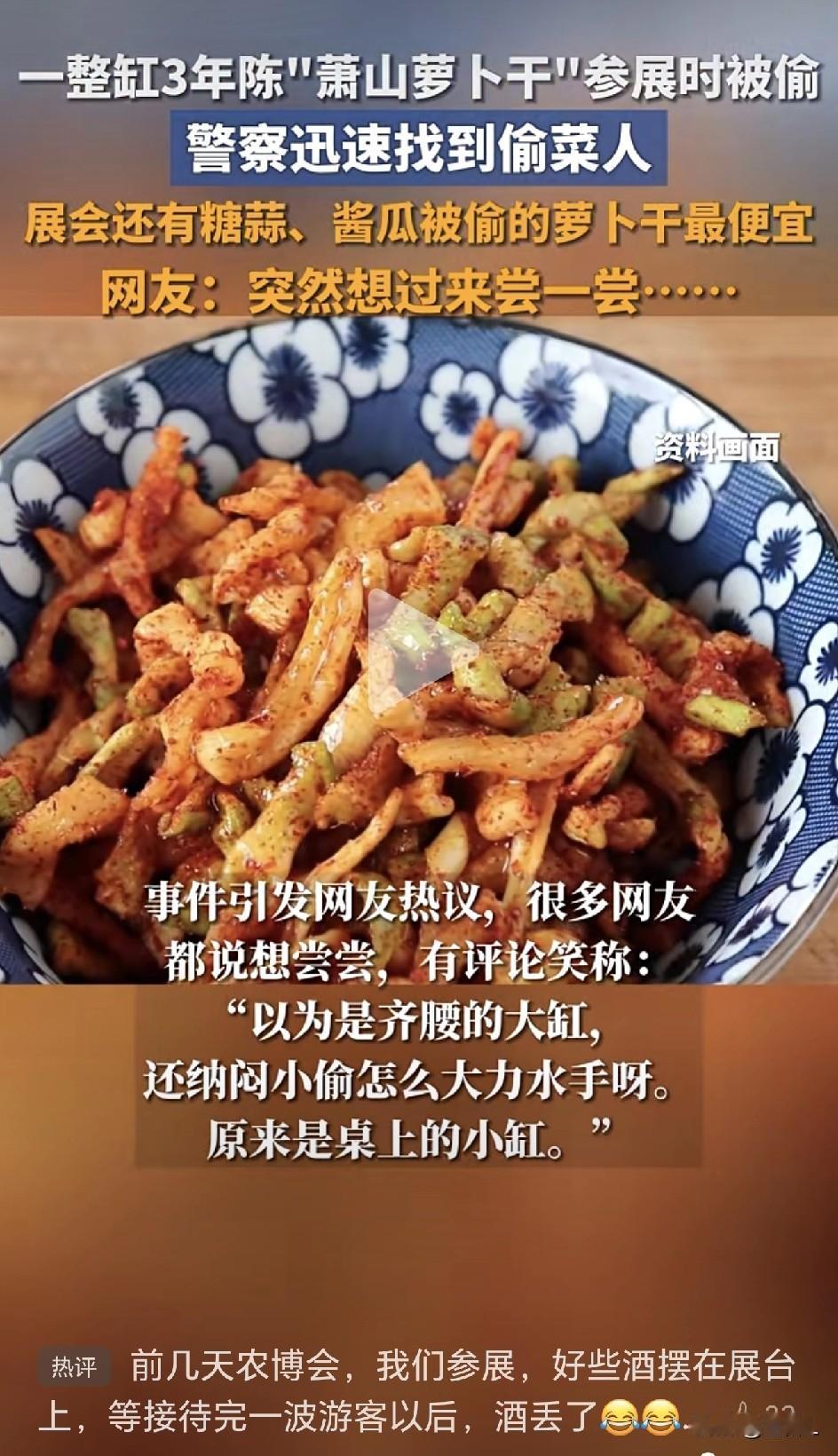 哈哈哈哈!杭州老博会惊现“咸菜大盗”:两阿姨扛走整缸非遗萝卜干,结果……笑不活了! 一大早的杭州老博会,“王泰和”展位的工作人员眼珠子差点掉出来——展台上那个沉甸甸的陶缸呢?!里面可是整整20斤、腌了三年的非遗萝卜干啊! 监控还原了这场“年度迷惑行为”:清晨六点,两位大妈(看着像母女)在展位前转悠,居然把整个菜缸“连锅端”了! 两人吭哧吭哧把缸搬到运河边,倒出萝卜干装进袋子,然后……随手把传承百年的非遗陶缸扔!掉!了! “三年陈的萝卜干也偷?这得多好吃啊!” 上午八点报警,中午十二点破案——警察叔叔的效率杠杠的! 找到两位大妈时,她们才知道自己偷的不是普通咸菜,而是用“三晒三腌”非遗工艺、陶罐密封发酵整整三年的宝贝! 最终大妈赔了230元,店家也大度原谅。但故事到这里才!刚!开!始! 万万没想到的后续:全网笑疯+展位卖爆! 这事儿冲上热搜后,网友评论笑死个人: 👉“这是最高级别的美食测评——好吃到要偷!” 👉“建议改名叫‘牢饭味萝卜干’” 👉“大妈:我就想尝尝三年的时光是什么味道” 更神奇的是,展位突然火了!好多人专程坐地铁来打卡: “我要买‘被偷同款’!” “就尝尝到底多好吃!” 旁边的倒笃菜当天补货两次还是被抢光! 老字号的神操作:把“黑历史”变“金招牌”! “王泰和”的负责人乐呵呵地透露:“我们准备推出新品——‘好吃到被偷走的萝卜干’!连包装都想好了,就画两个大妈扛缸跑!” 博览会主办方一边加强安保,一边感慨:“这安保费用,得让‘王泰和’报销——谁让他们家咸菜这么招贼呢!” 笑着笑着就悟了:偷得走萝卜干,偷不走的是…… 其实啊,这缸被偷的三年陈只是入门款,“王泰和”还有窖藏三十年的“萝卜干王”呢! 时间在这些陶缸里慢慢酝酿的,不只是咸香滋味,更是代代相传的生活智慧。 两位大妈大概没想到,她们这一“搬”,反而搬出了非遗美食的全国广告。 看来真正的好味道,连“小偷”都会用脚投票;真正的老手艺,时光终究会为它正名。 最后想问一句:阿姨,那萝卜干…真那么好吃吗?🤣 信息来源于荆楚网,侵联删!