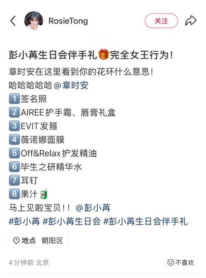 彭小苒的生日会采取免费开放模式,伴手礼价值高达一千多,她的过膝靴收藏数量也成为热议的内容。彭小苒生日会免费彭小苒送粉丝一千多的伴手礼彭小苒你到底有多少双过膝靴