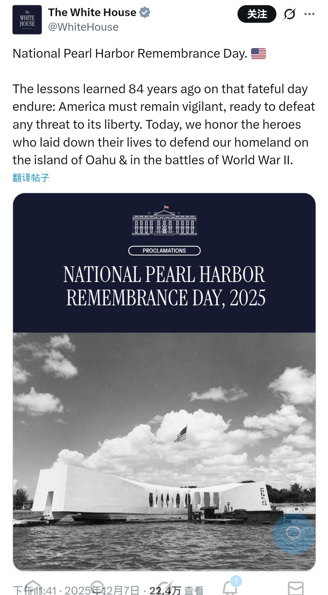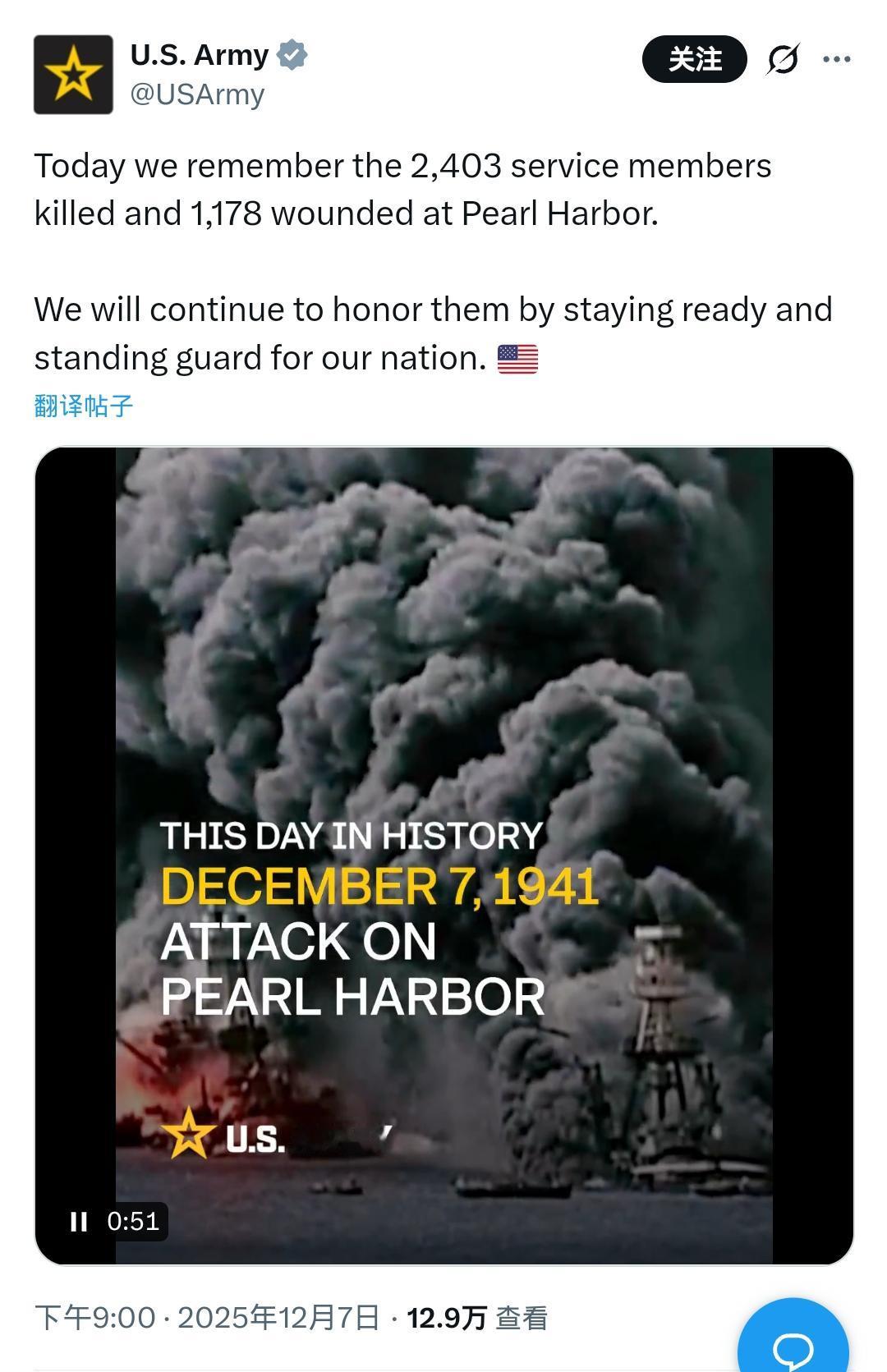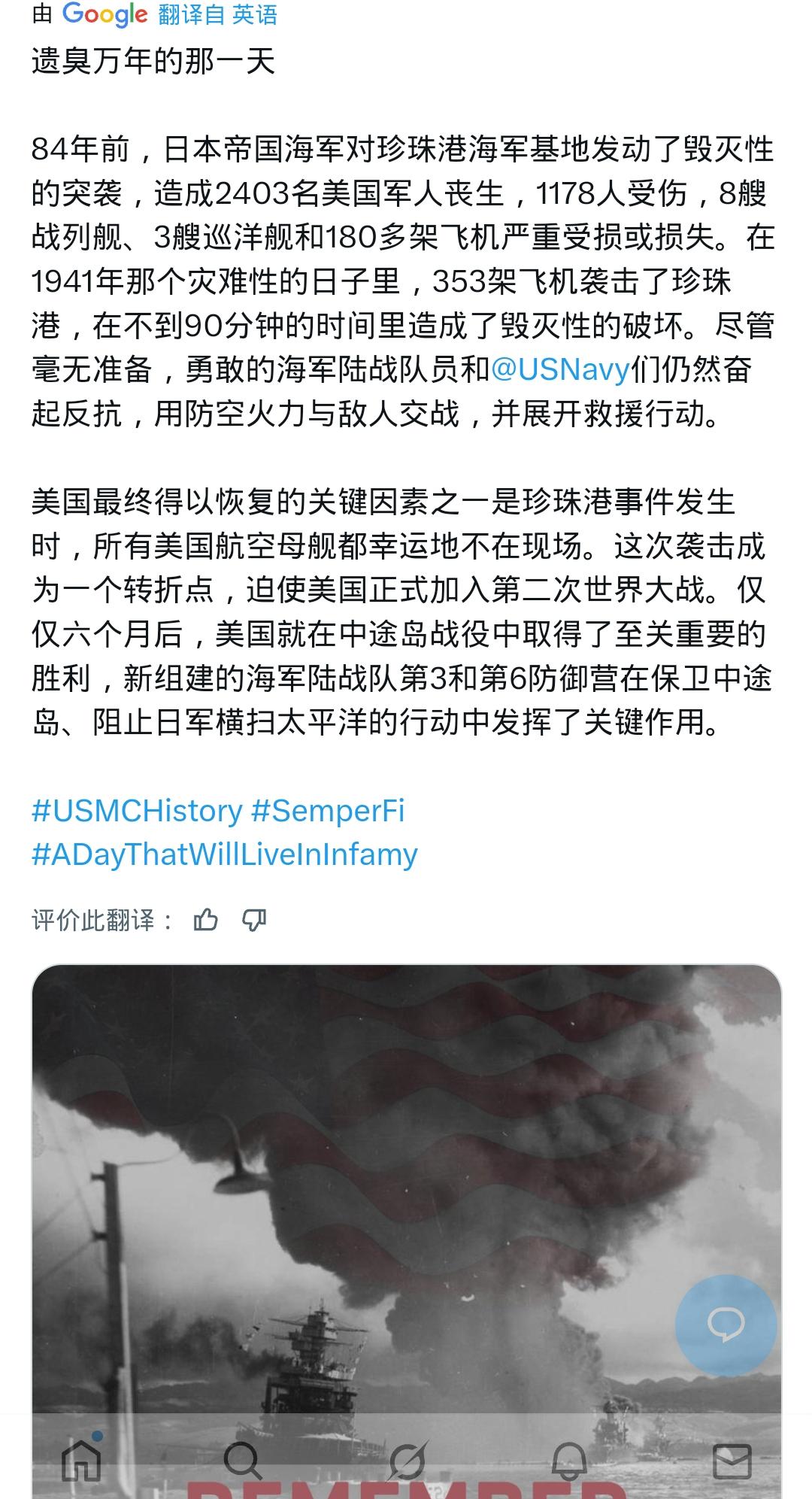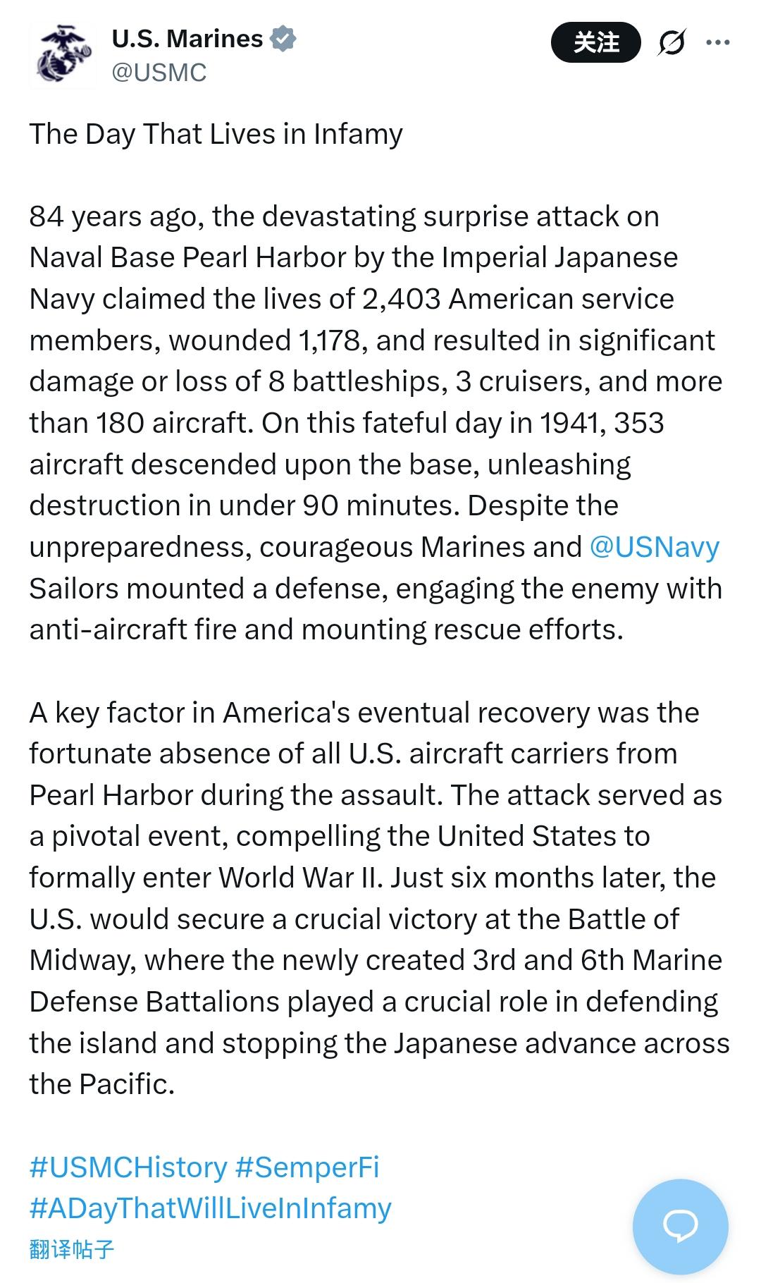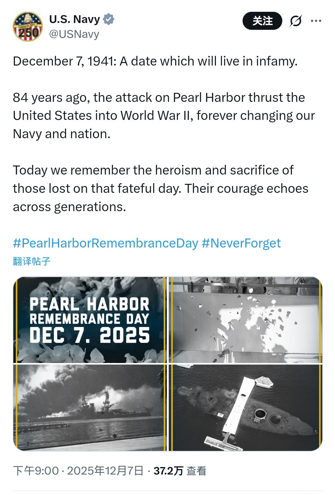 “遗臭万年的一天”——可算有个敢说真话的了! 84年不逢五不逢十,本没啥“必须纪念”的由头,可战争部、白宫那帮人偏要凑这个热闹——却对着“谁炸的珍珠港”支支吾吾,跟怕提“日本”俩字烫嘴似的! 还得是海军陆战队“不含糊”,直接把“封嘴胶”撕了: “84年前,日本帝国海军突袭珍珠港,2403名美军没了,1178人伤,8艘战列舰、3艘巡洋舰报废……尽管措手不及,陆战队员和水兵还是抄起防空炮跟敌人拼了!” 连“航母不在港”“六个月后中途岛反击”都说得明明白白——这才叫“纪念历史”! 要是总搞“掐头去尾、去细节抽脉络”那套,早晚把人绕晕! 陆战队这波,才叫“没白提‘历史’俩字”! 珍珠港偷袭珍珠港到底是谁破译了日本偷袭珍珠港的情报 Source: X