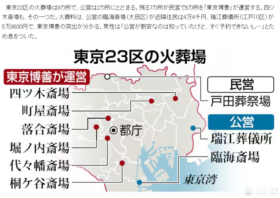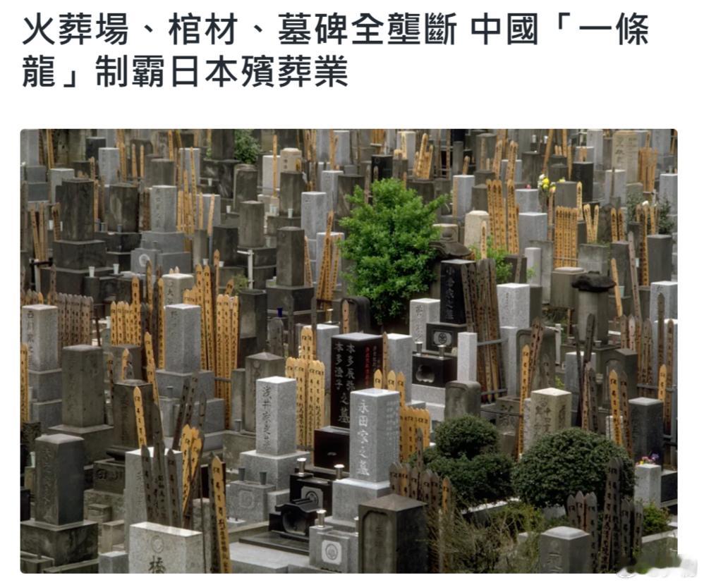 《产经新闻》:从棺材到牌位、从火葬场到墓碑… 中国企业垄断日本殡葬业 !东京共有 9 家火葬场,有 7 家属于民营,其中 6 家由「东京博善」经营,而「东京博善」2019年被一家中国资本收购,负责东京都内 23 个区 70% 的殡葬业务,包括日本前首相安倍晋三的遗体,也是由东京博善所属的桐谷火葬场火化。日本东京火葬费从2020年的5 万日元已经涨至2024年的 9 万日元,当地民众直呼“死不起”,认为是背后的中资集团所致。事实上不仅火葬场,日本人「最终」用的棺材、墓碑与骨灰坛也几乎来自中国。中国企业不仅几乎垄断了日本人殡葬“一条龙”式服务,据说现在连岌岌可危的寺庙与神社也成为中资收购的目标。这家中国资本眼光不错,毕竟殡葬业是日本为数不多的朝阳产业......