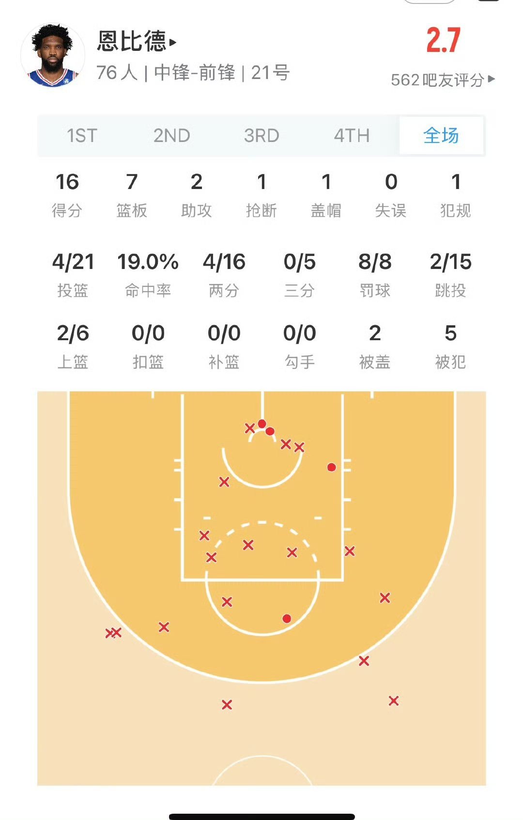 恩比德全场比赛21中4,三分5中0,最后时刻关键球单打里弗斯,后仰跳投再打一铁,湖人庆功宴上你不来上桌都不敢动筷子!湖人险胜76人