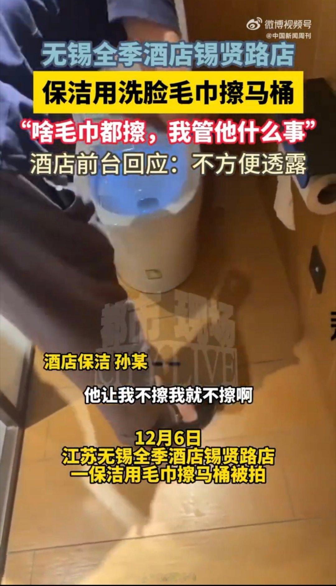 全季酒店保洁用毛巾擦马桶当时我就震惊了!这又是“开除”加“保证”的熟悉配方,却难掩酒店业积弊已久的卫生沉疴。一句“我什么毛巾都擦”的嚣张回应,撕开了所谓标准化管理的脆弱伪装,暴露的绝非仅是某个保洁员的失德,更是整个行业对基层岗位培训监管的系统性失灵。涉事酒店企图用开除个体来切割责任、平息舆论,却回避了更本质的追问:若无严密的流程设计与常态监督,如何保证下一位保洁不会重蹈覆辙?消费者每一次入住,都不该成为卫生盲区里的“抽奖”。行业若不能从根上重建信任机制,再多的“严加管理”承诺,也不过是下一次丑闻前的空洞回响。