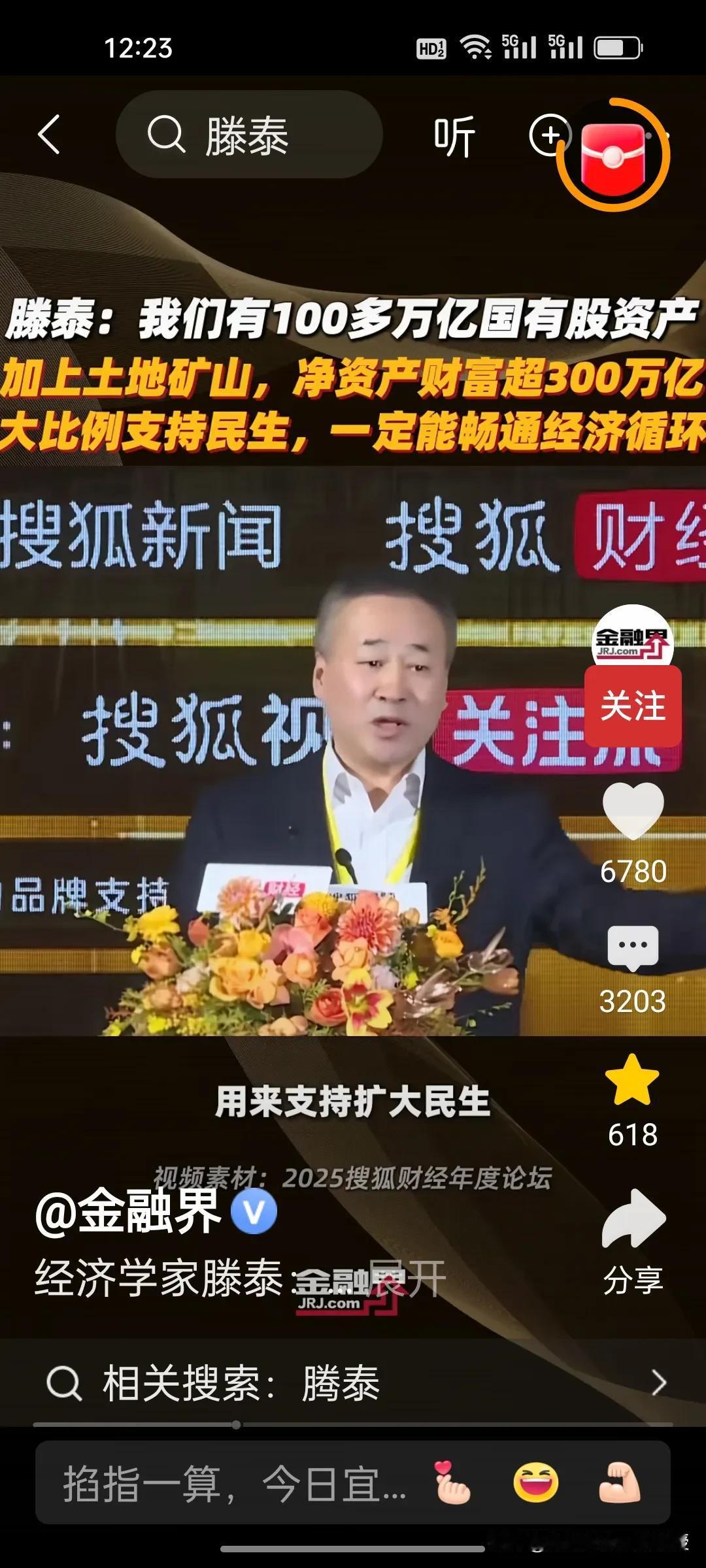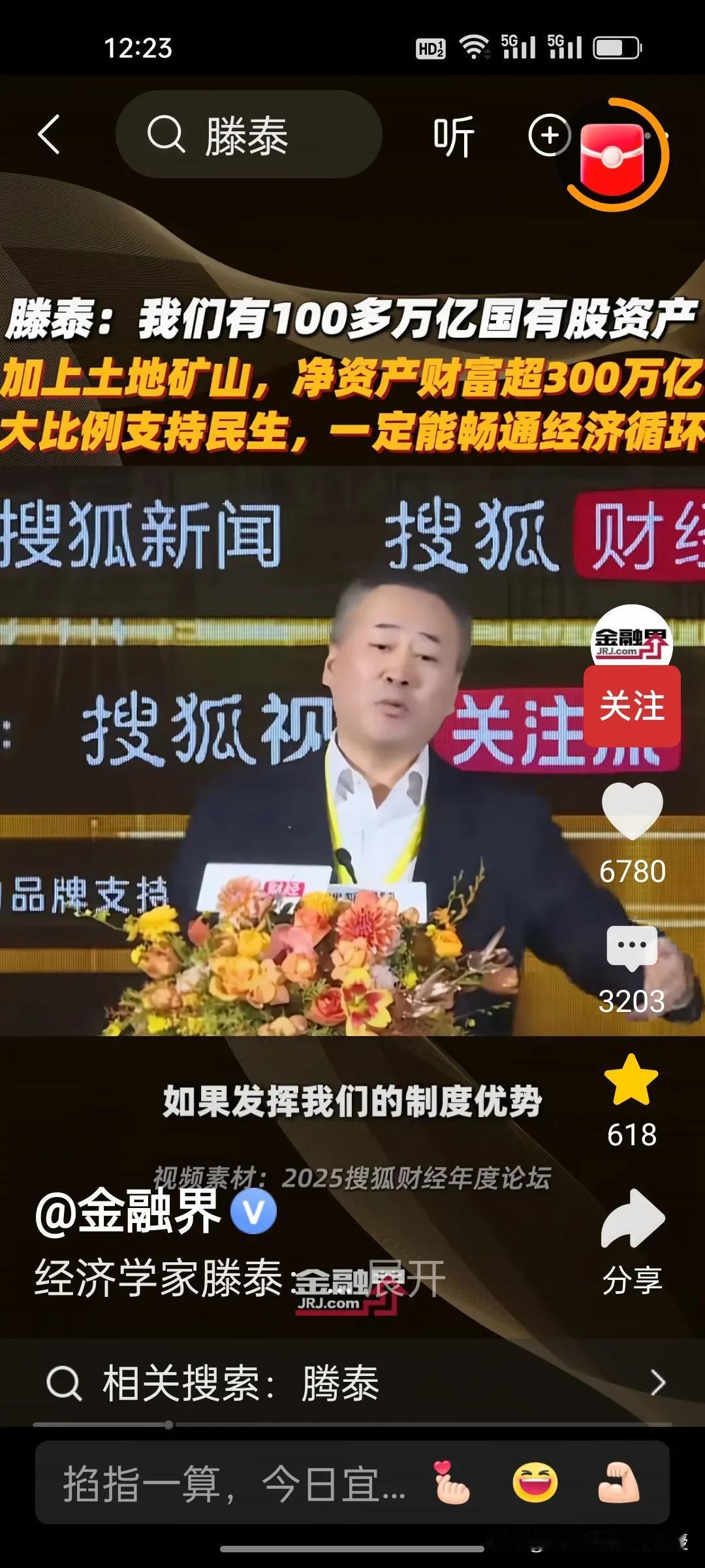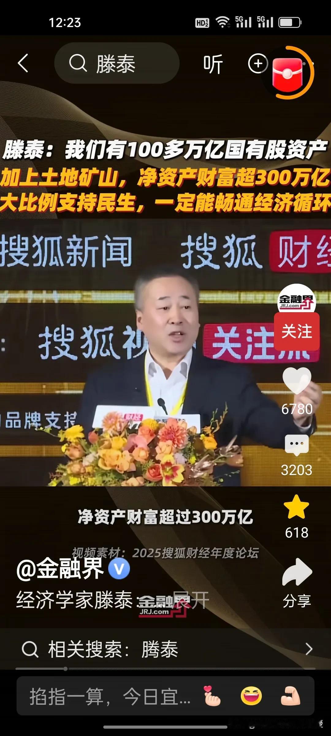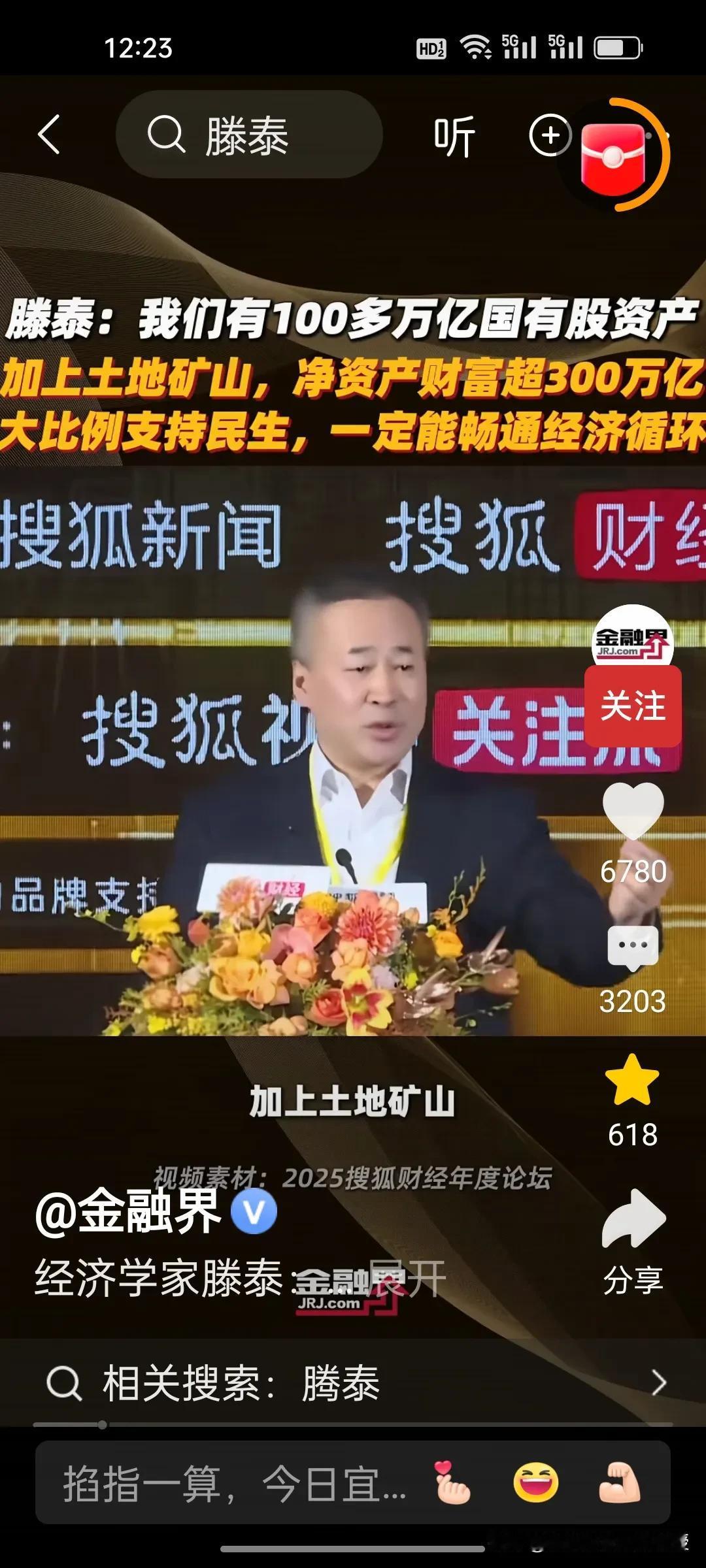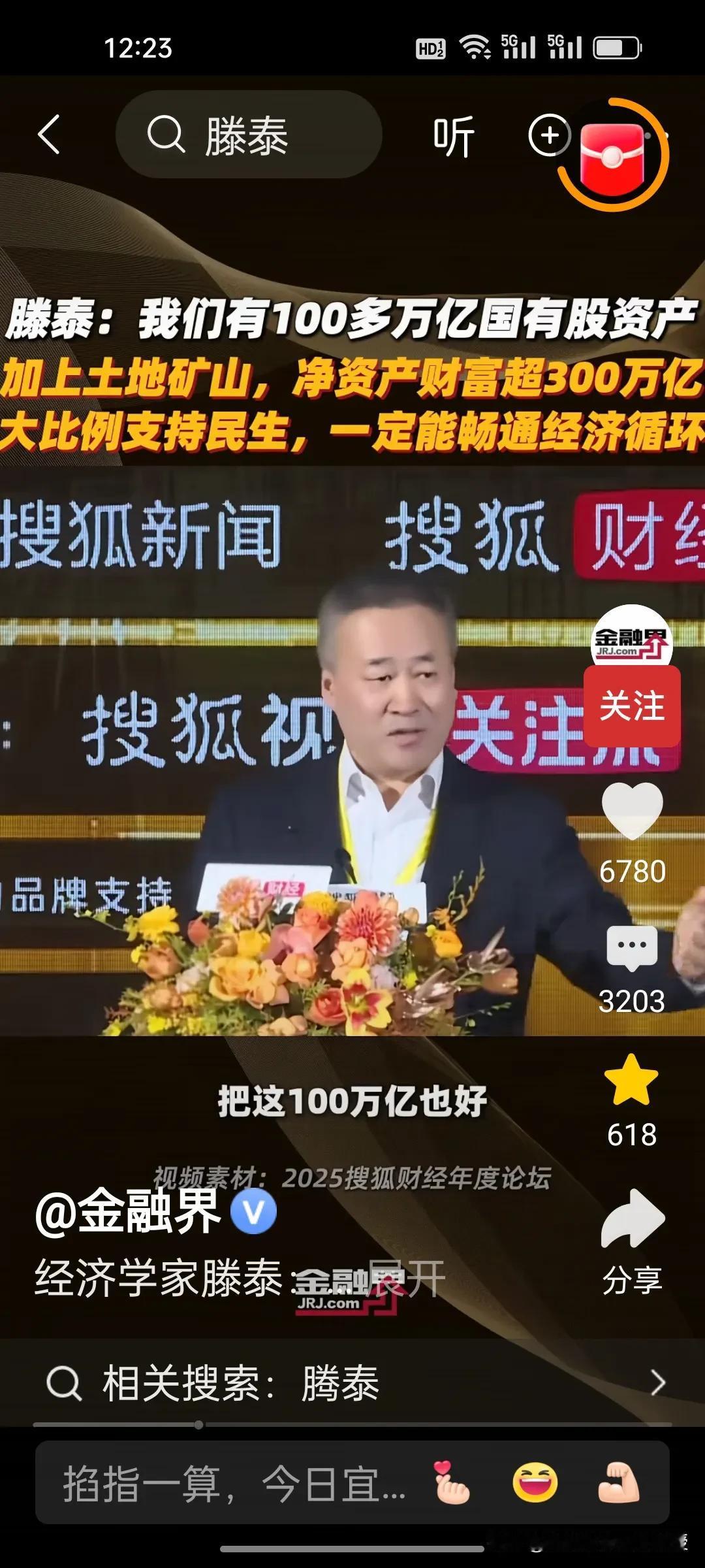 经济学家滕泰给促进消费支高招了!他在今年的搜狐财经年会上表示,我们有100多万亿的国有资产,加上土地矿山,净资产财富大概有300万亿,如果大比例地支持社保民生,我们的经济消费一定能促进起来,他还举例新加坡三个国有资产公司每年拿50%出来分红,它贡献了国家的财政收入的20%。 滕泰这几年在公开场合的发言不多,但是刚刚看到他的这番话,相信大多数人都是认同的,把国有资产的“家底”真正转化为民生保障的“底气”,让老百姓敢花钱、有钱花,消费复苏才会有最扎实的支撑,这招确实说到了关键点上!