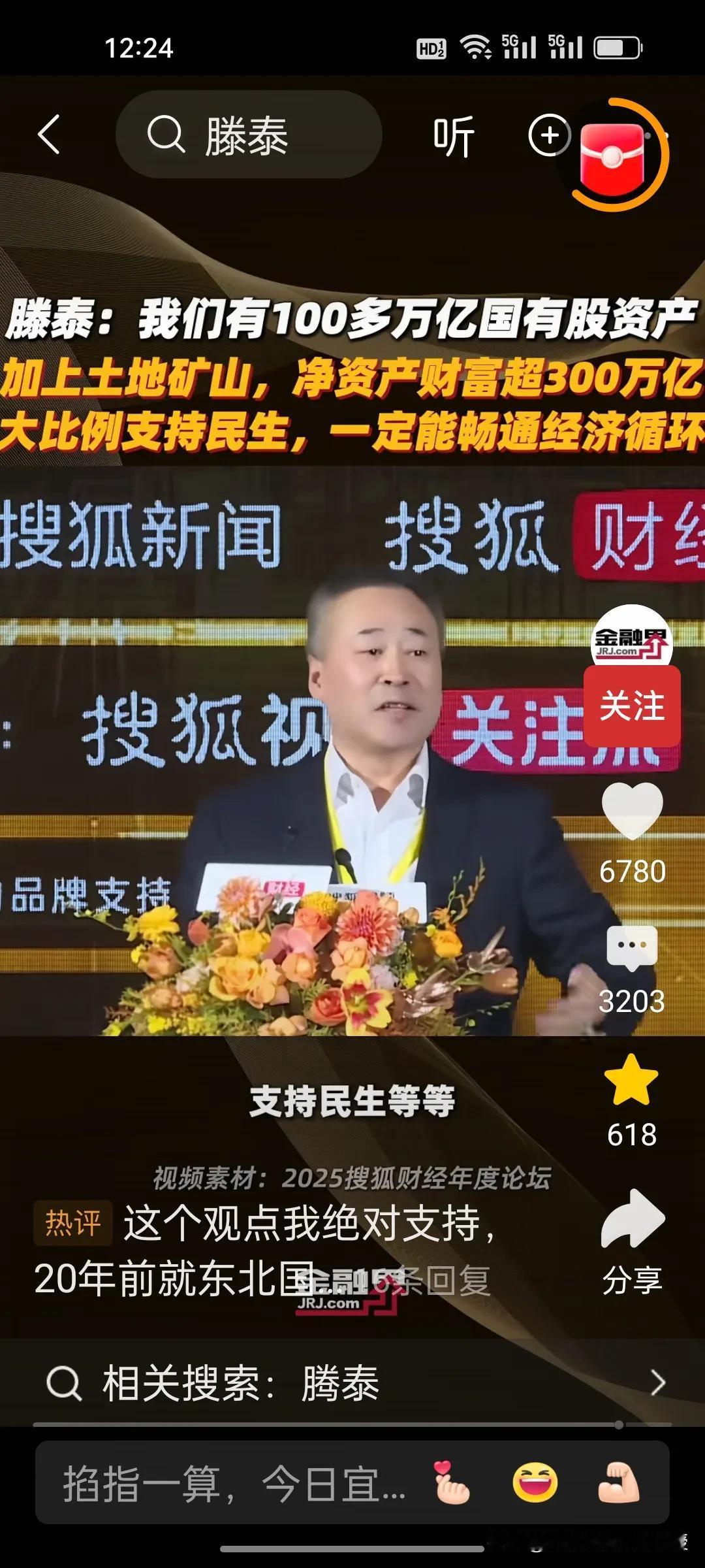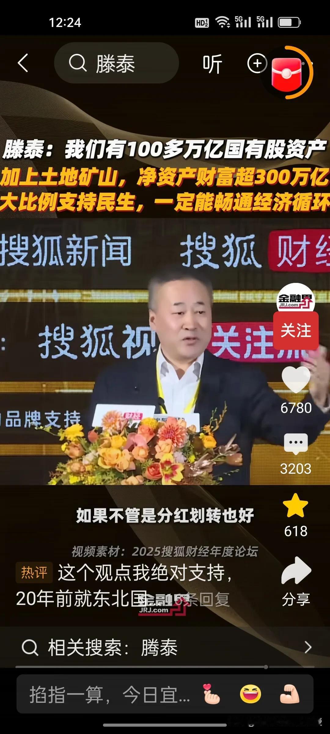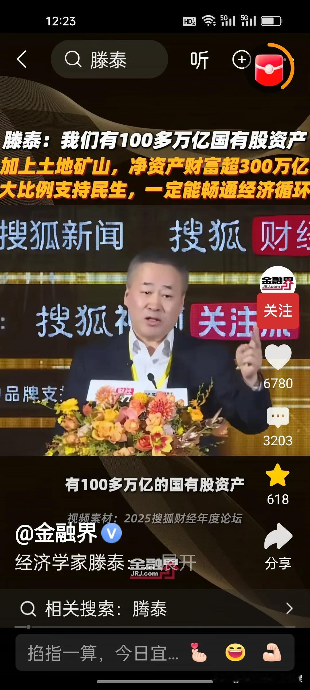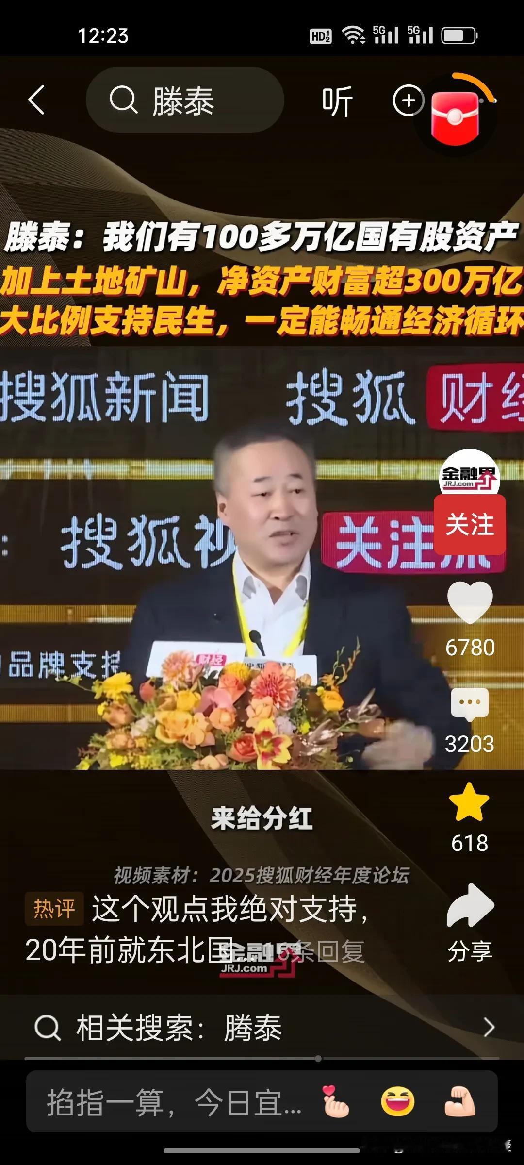 经济学家滕泰给促进消费支高招了!他在今年的搜狐财经年会上表示,我们有100多万亿的国有资产,加上土地矿山,净资产财富大概有300万亿,如果大比例地支持社保民生,我们的经济消费一定能促进起来,他还举例新加坡三个国有资产公司每年拿50%出来分红,它贡献了国家的财政收入的20%。 滕泰这几年在公开场合的发言不多,但是刚刚看到他的这番话,相信大多数人都是认同的,把国有资产的“家底”真正转化为民生保障的“底气”,让老百姓敢花钱、有钱花,消费复苏才会有最扎实的支撑,这招确实说到了关键点上!