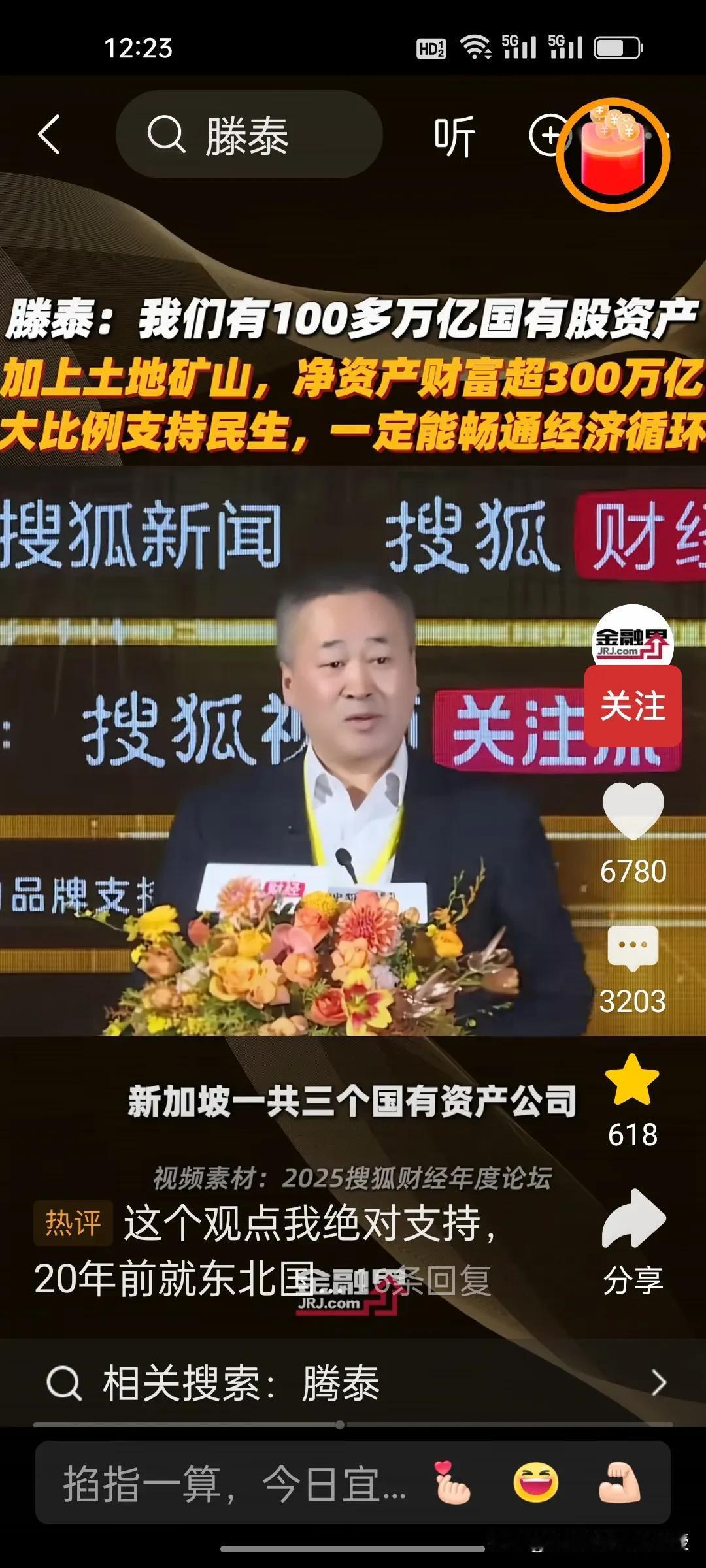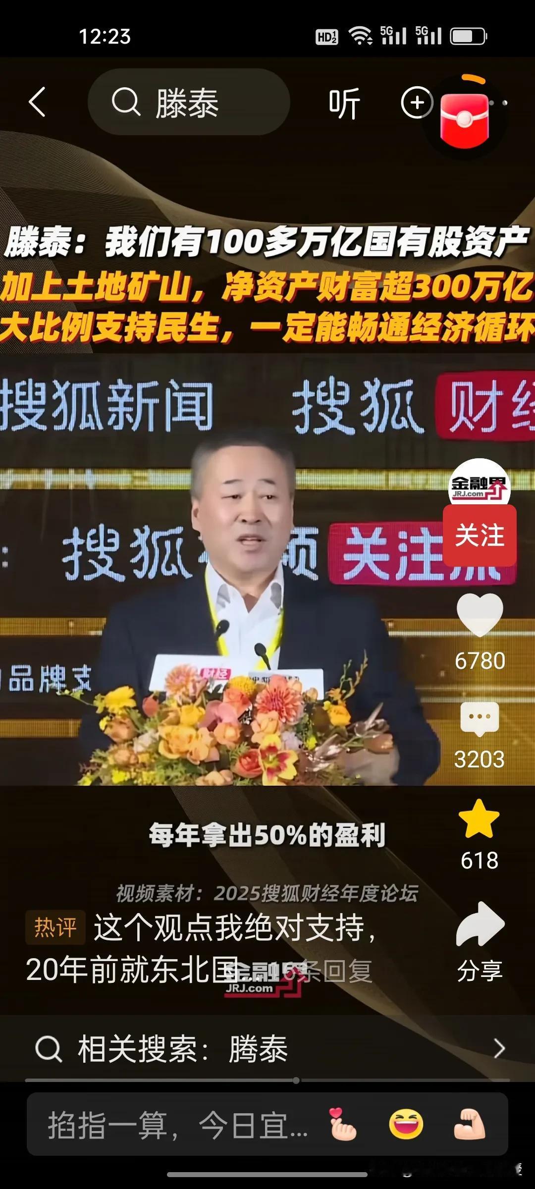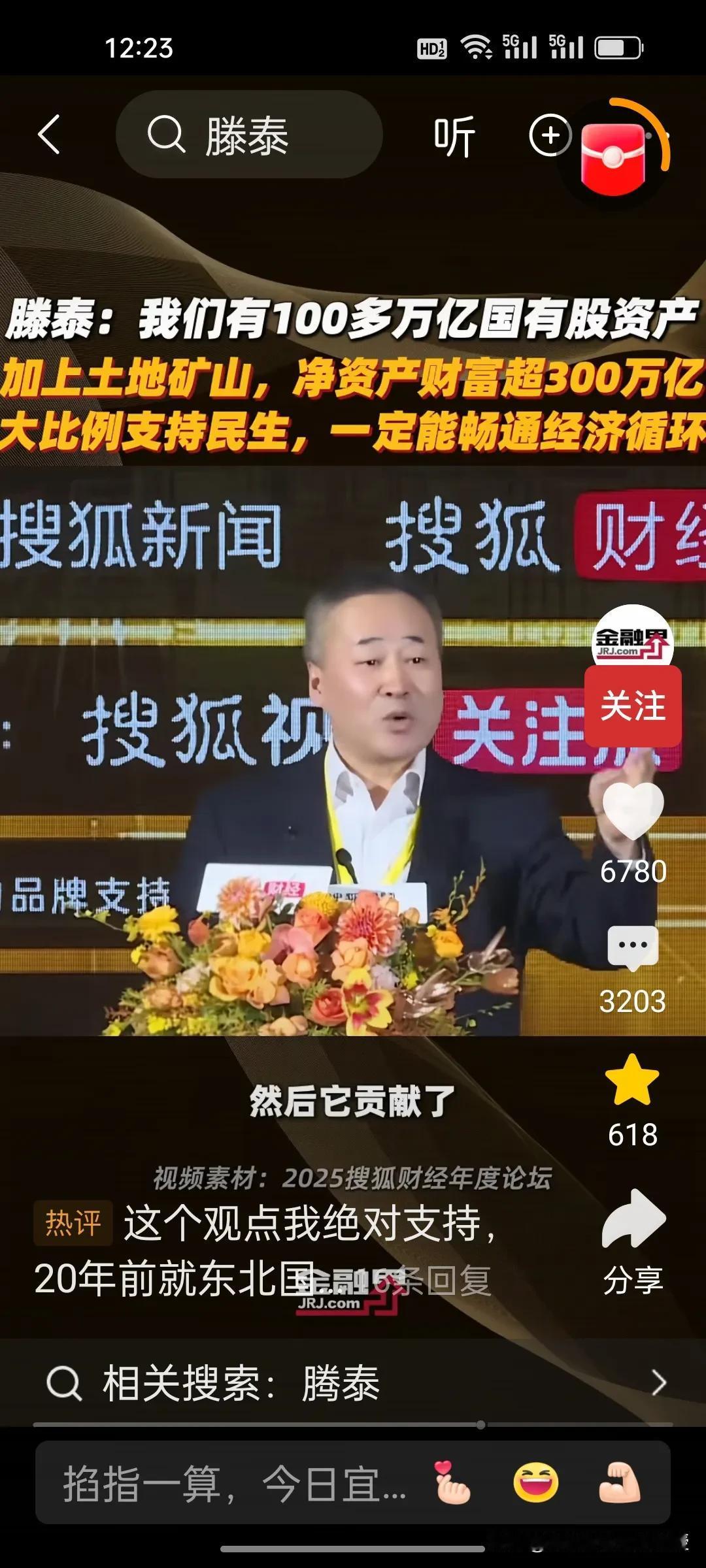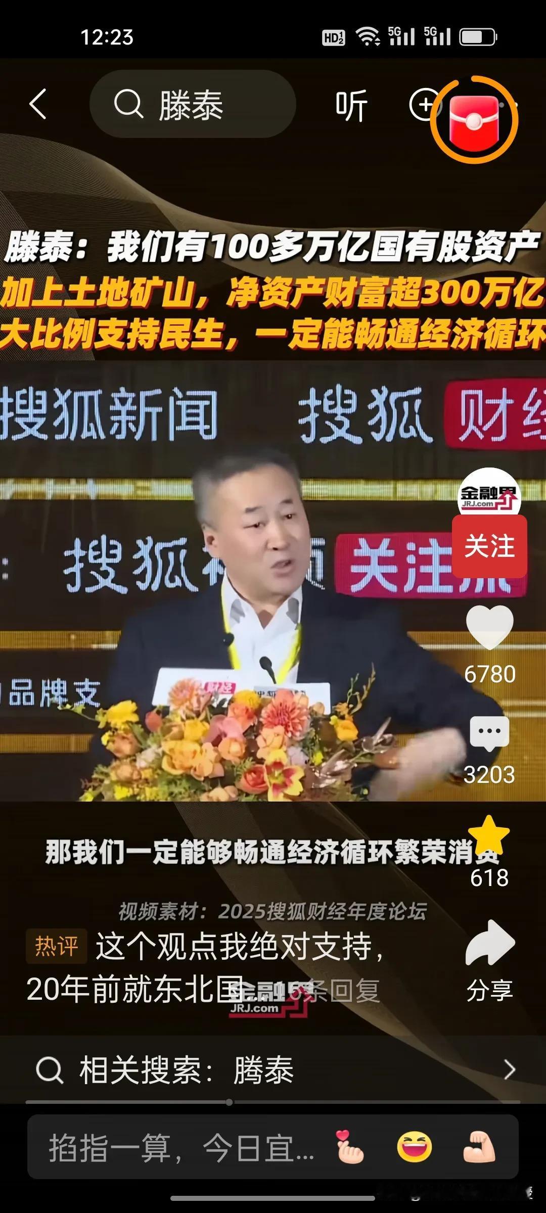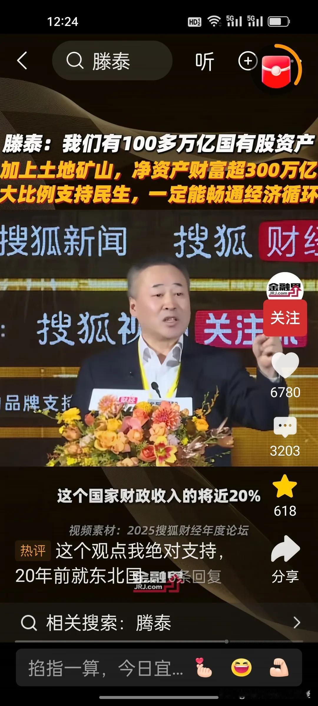 经济学家滕泰给促进消费支高招了!他在今年的搜狐财经年会上表示,我们有100多万亿的国有资产,加上土地矿山,净资产财富大概有300万亿,如果大比例地支持社保民生,我们的经济消费一定能促进起来,他还举例新加坡三个国有资产公司每年拿50%出来分红,它贡献了国家的财政收入的20%。 滕泰这几年在公开场合的发言不多,但是刚刚看到他的这番话,相信大多数人都是认同的,把国有资产的“家底”真正转化为民生保障的“底气”,让老百姓敢花钱、有钱花,消费复苏才会有最扎实的支撑,这招确实说到了关键点上!