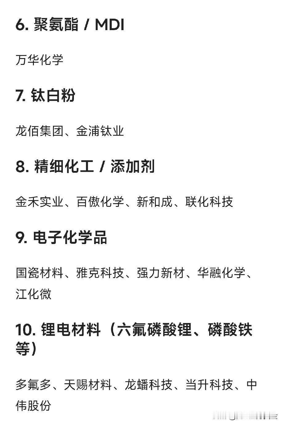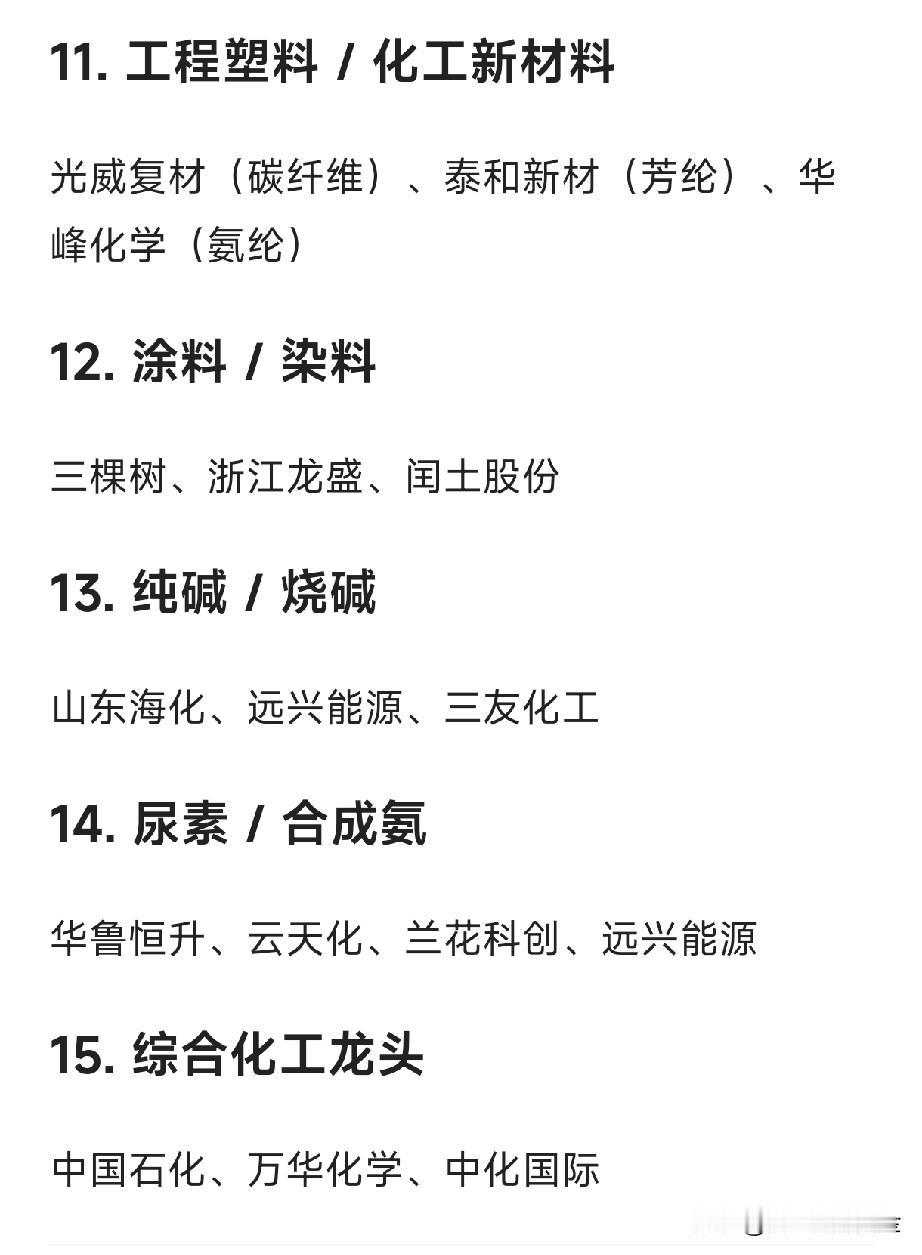 化工概念细分龙头企业汇总: 1. 磷化工 云天化、兴发集团、湖北宜化、川恒股份、川发龙蟒 2. 氟化工 巨化股份、三美股份、永和股份、多氟多、东岳集团 3. 农化(农药/化肥) 扬农化工、利尔化学、新洋丰、盐湖股份、亚钾国际 4. 煤化工 华鲁恒升、宝丰能源、鲁西化工、丹化科技、东华科技 5. 石化炼化 恒力石化、荣盛石化、中国石化、卫星化学 6. 聚氨酯 / MDI 万华化学 7. 钛白粉 龙佰集团、金浦钛业 8. 精细化工 / 添加剂 金禾实业、百傲化学、新和成、联化科技 9. 电子化学品 国瓷材料、雅克科技、强力新材、华融化学、江化微 10. 锂电材料(六氟磷酸锂、磷酸铁等) 多氟多、天赐材料、龙蟠科技、当升科技、中伟股份 11. 工程塑料 / 化工新材料 光威复材(碳纤维)、泰和新材(芳纶)、华峰化学(氨纶) 12. 涂料 / 染料 三棵树、浙江龙盛、闰土股份 13. 纯碱 / 烧碱 山东海化、远兴能源、三友化工 14. 尿素 / 合成氨 华鲁恒升、云天化、兰花科创、远兴能源 15. 综合化工龙头 中国石化、万华化学、中化国际