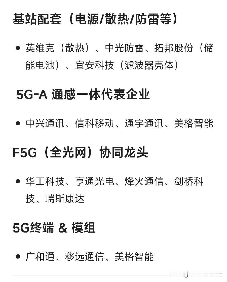 5G概念细分龙头企业汇总: 主设备 & 基站系统 中兴通讯、信科移动 天线 & 射频前端 通宇通讯、武汉凡谷、硕贝德、国人科技 光通信 & 光模块 中际旭创、新易盛、天孚通信、光迅科技 高频PCB & 材料 生益科技、胜宏科技、沪电股份 5G芯片 & 射频前端芯片 慧智微、移芯通信、三安光电、国博电子 基站配套(电源/散热/防雷等) 英维克(散热)、中光防雷、拓邦股份(储能电池)、宜安科技(滤波器壳体) ️ 5G-A 通感一体代表企业 中兴通讯、信科移动、通宇通讯、美格智能 F5G(全光网)协同龙头 华工科技、亨通光电、烽火通信、剑桥科技、瑞斯康达 5G终端 & 模组 广和通、移远通信、美格智能