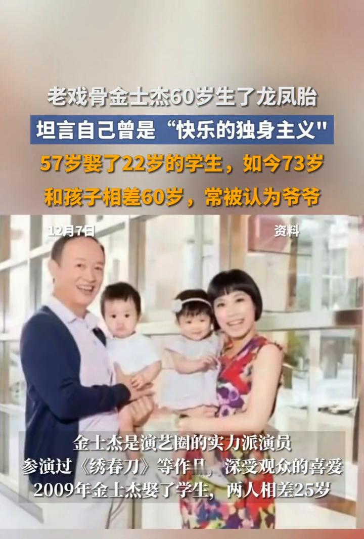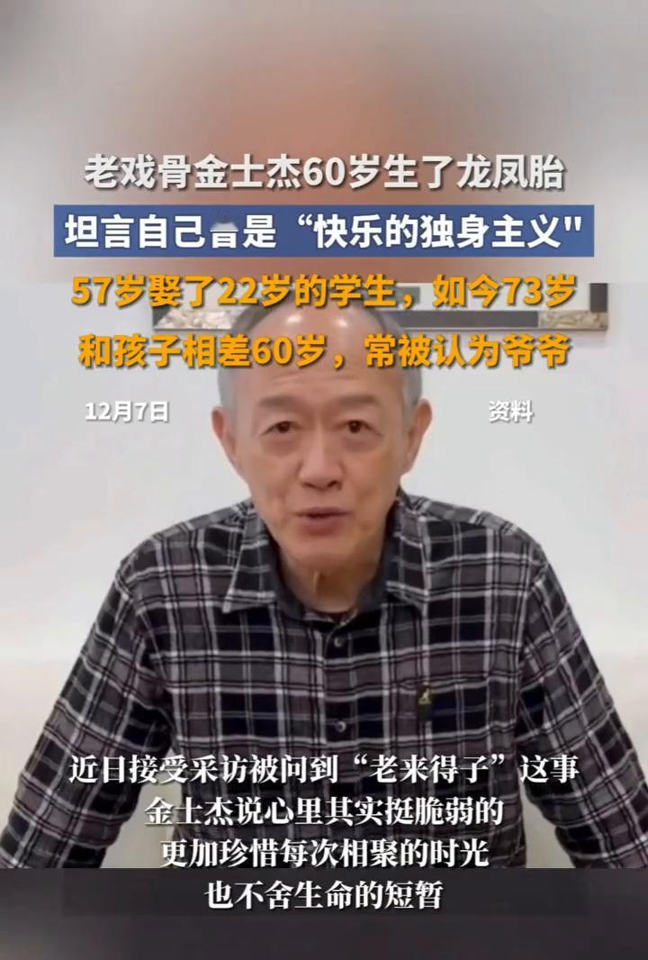 老戏骨金士杰60岁生了龙凤胎,坦言自己曾是"快乐的独身主义"。 57岁娶了22岁的学生,如今73岁,和孩子相差60岁,常被认为爷爷。 12月7日,近日接受采访被问到"老来得子"这事,金士杰说心里其实挺脆弱的,更加珍惜每次相聚的时光,也不舍生命的短暂。 金士杰是演艺圈的实力派演员,参演过《绣春刀》等作品,深受观众的喜爱。2009年金士杰娶了学生,两人相差25岁,花甲之年迎来了一对龙凤胎。73岁的他常常被误认为是孩子的爷爷,但他对此表现得十分豁达,别人怎么说他都欣然接受。