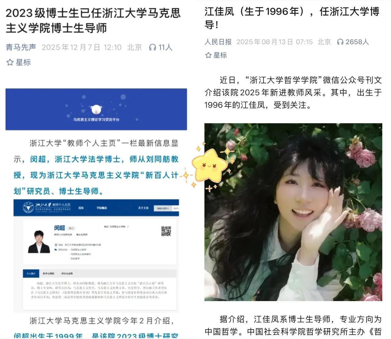 26岁闵超成浙大博导上热搜, 才发现8月29岁江佳凤早已亮相 这哪里是年轻有为,分明是 浙大“新百人计划”打破论资排辈的魄力! 别只羡慕他们的年纪, 闵超博士期间拿遍国奖, 核心期刊论文填补学院空白; 江佳凤深耕宋明理学, 6篇高水平论文+国家社科项目在手, 实力远超同龄人。 2020年推出的“新百人计划”, 不卡资历只看硬实力, 35岁以下就能进长聘体系, 直接给博导资格。 这才是真正的“英雄不问出处”, 让青年学者凭成果说话。 高校抢人才从不是看年龄, 而是打破条条框框的勇气。 这种让实干者上位的机制, 才是学术创新的底气。 你觉得年轻学者该靠资历还是实力立足?评论区聊聊~ 浙大新百人计划 90后博导
