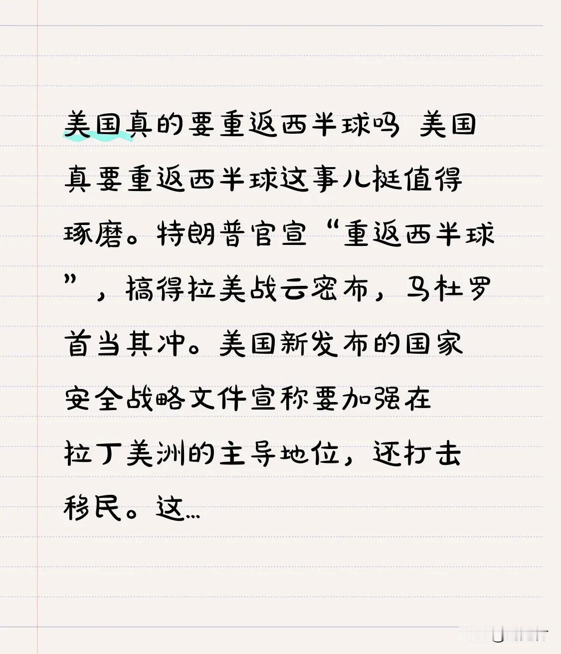 美国真的要重返西半球吗 美国真要重返西半球?此事值得深思。特朗普官宣“重返西半球”,令拉美战云密布,马杜罗首当其冲。美国新发布的国家安全战略文件宣称加强在拉丁美洲的主导地位,还打击移民。 该文件十分矛盾,既称不将自身价值观强加给外国,又要干涉盟国的内政。《华尔街邮报》指出,文件“充斥着宏大愿景和笼统概括,却缺乏细节”。它一边说美国支撑世界秩序的时代结束,一边又要阻止其他国家在全球称霸。美国是真心重返西半球,还是另有算计,有待观望。 美国战略调整 美国西太平洋 美国独立 西半球危机