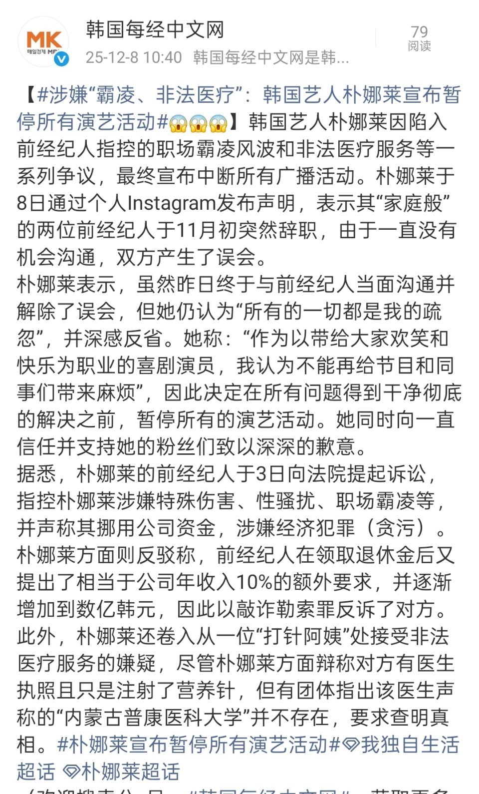 朴娜莱方再回应被曝职场霸凌朴娜莱我独录制不取消据韩媒,朴娜莱方面相关人士表示: