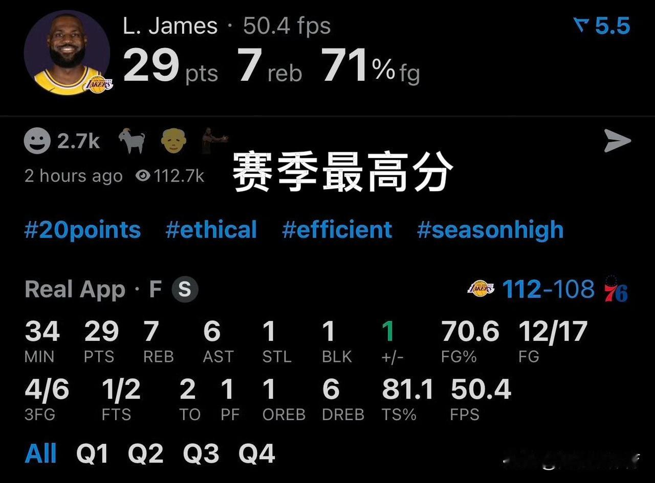 大声告诉我!如何评价今天的詹姆斯: 17投12中 三分球6中4 罚球2中1 29分7篮板6助攻1抢断1盖帽 第四节得到12分,并贡献致命抢断,带领湖人客场战胜76人 当你觉得他不行时,他又可以了 马上41岁的年纪了,我不祈求你什么 努力拿一个冠军吧 以后这种情况可能很少见了 但是他总能提醒我们,他还不服老 [赞][赞][赞],詹姆斯