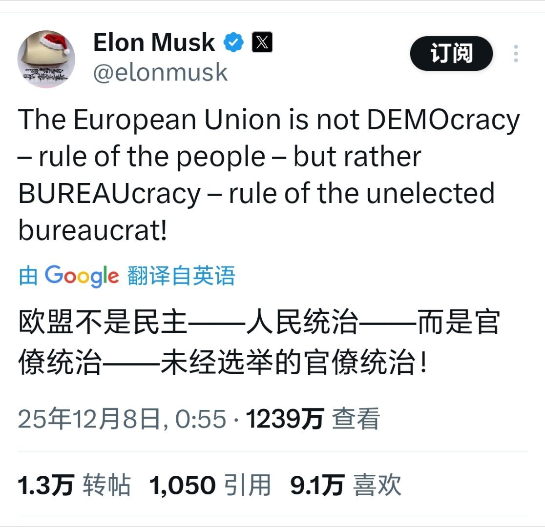 马斯克呼吁欧盟解散马斯克继续吐槽欧盟