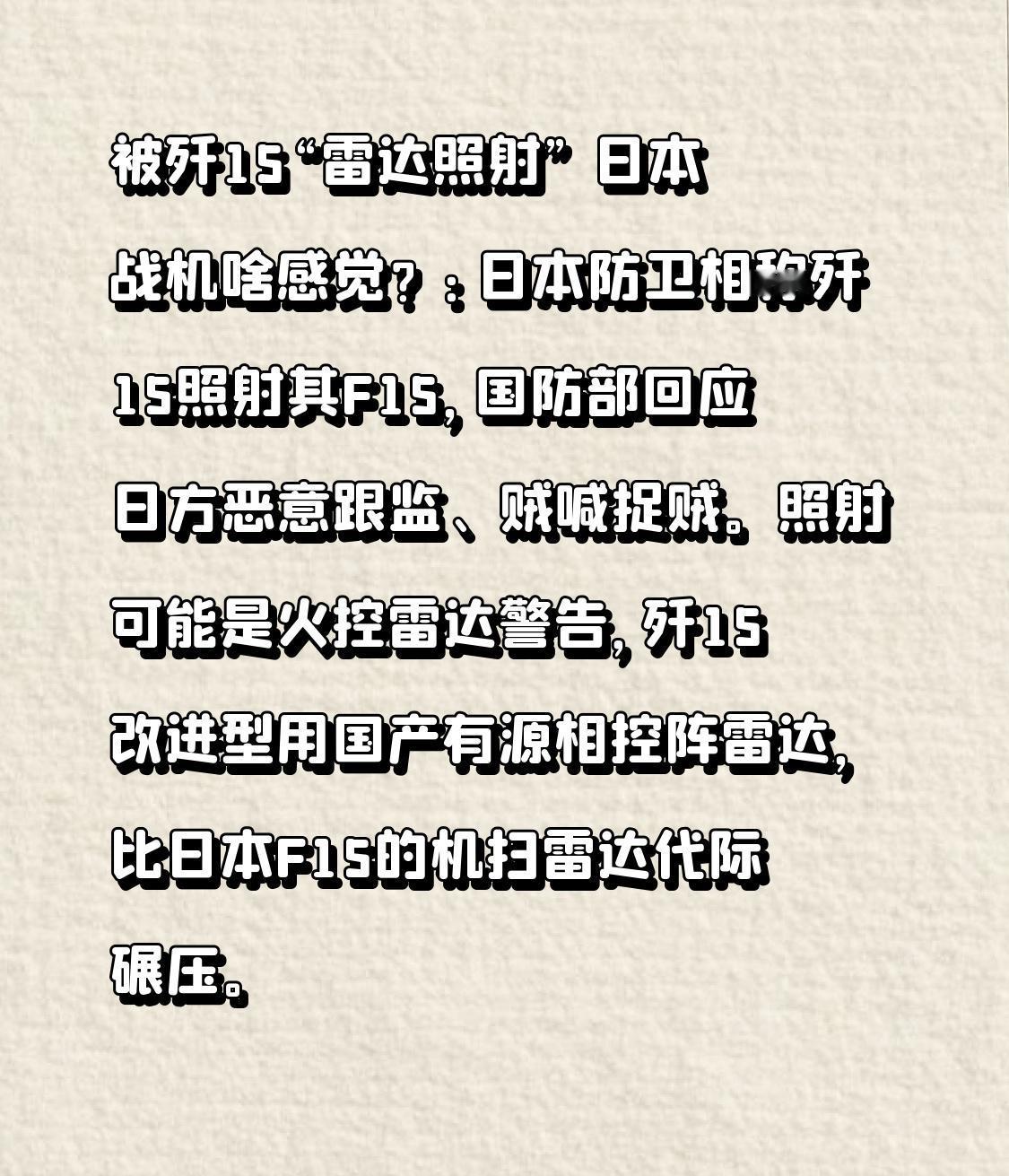 被歼15“雷达照射” 日本战机啥感觉?:日本防卫相称歼15照射其F15,国防部回应日方恶意跟监、贼喊捉贼。照射可能是火控雷达警告,歼15改进型用国产有源相控阵雷达,比日本F15的机扫雷达代际碾压。