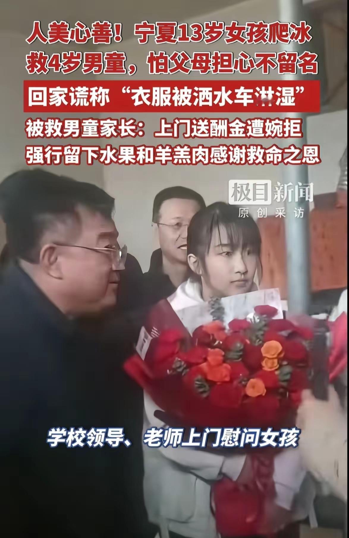 古有花木兰替父从军,今有宁夏13岁女孩冰窟救人,现在的小孩哥、小孩姐都是好样的,值得佩服! 据了解宁夏13岁小孩姐冰窟救人的小孩姐已经找到了,她是同心县二中初一学生,目前此事件已被校领导知晓,不仅专门到家慰问了小孩姐,而且准备在周一升旗仪式上当着全校师生面表彰她!同时被救小男孩的家长带着锦旗和礼物还有红包想感谢小孩姐,结果通通被小孩姐拒绝了。根据小孩姐的说法,她从小崇拜消防员,长大想当消防员,这次救人也没想那么多,只是因为自己体重轻,冰层不容易破,也没有考虑自己会不会有危险,最后看到男孩得救,自己就回家去了! 在我看来,现在的小孩哥和小孩姐不但是人品好,而且各个都是聪明伶俐,做人做事都非常的有大将之风!从他们的做人做事的风格来看,他们这一代人一定比我们这一代人强的多,更加难得的是继承了我们中华民族善良的这种基因,总而言之我认为现在的小孩哥和小孩姐都很不错!