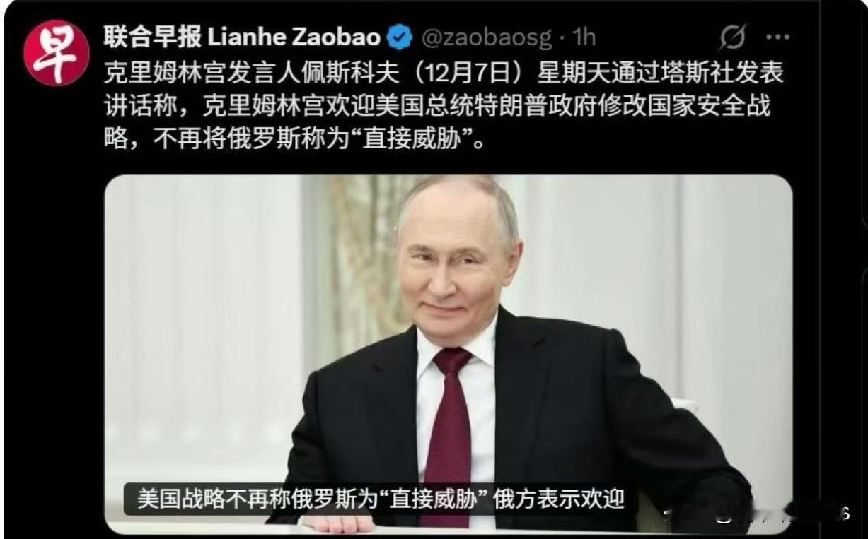 克里姆林宫对近期发布的美国国家安全战略(NSS)做出了积极回应。克里姆林宫发言人佩斯科夫于12月7日表示,新的美国国家安全战略“与俄罗斯的愿景基本一致”,可以作为俄美两国继续致力于达成乌克兰和平解决方案的“一定保障”。佩斯科夫表示,克里姆林宫认为,国家安全战略呼吁与俄罗斯合作,并且没有将俄罗斯列为对美国的“直接威胁”,这是一个“积极的举措”。俄罗斯联邦安全会议副主席梅德韦杰夫表示,更新后的国家安全战略表明,美国准备讨论与“安全架构”相关的问题,这里所指的“安全架构”很可能是欧洲安全架构以及北约在其中扮演的角色。梅德韦杰夫表示,国家安全战略“出乎意料地”与俄罗斯关于共享安全和尊重国家主权的理念相符。梅德韦杰夫表示,“对话的机会之窗”现在已经“半开”。