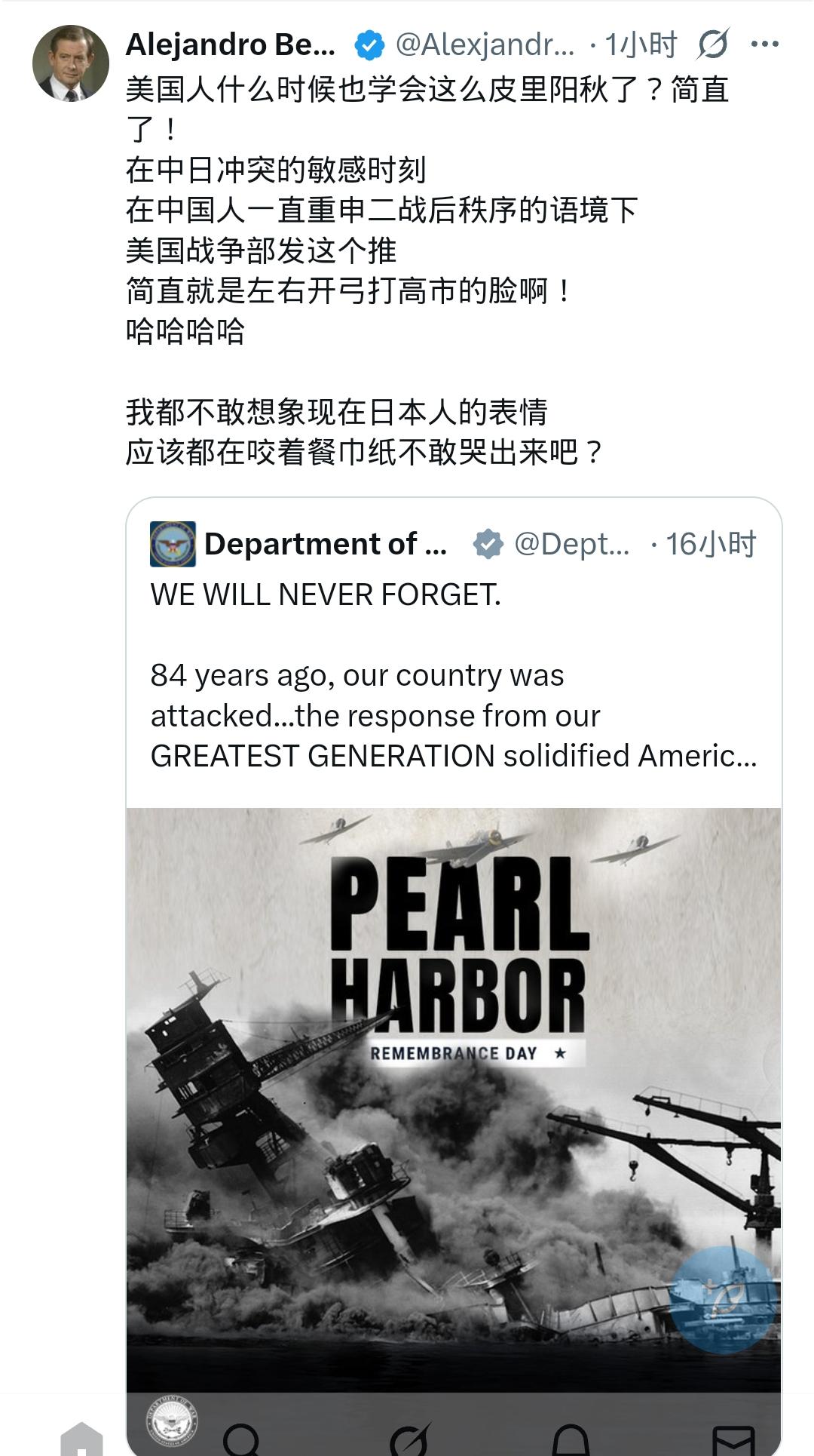 这算“皮里阳秋”吗?我看未必 “皮里阳秋”要成立,得双方共用同一本“历史密码本”。美国战争部在珍珠港事件84周年这个不三不四的年份发帖纪念,显然意有所指——正值“敌国条款”话题重燃,这分明是一次“点到为止”的敲打:挤个眼,提个醒,话说半句,你懂就行。 可问题在于,这份含蓄的提醒,对面接得住吗? 多数日本年轻人在淡化甚至美化的历史教育下,对二战本就印象稀薄。华盛顿或许真想玩一把“皮里阳秋”,到头来却可能成了“对牛弹琴”——政客或许心知肚明,民间却一片无感。 一场需要默契的外交微操,遇上错位的历史认知,再精致的潜台词,也怕没人听懂。 Source: X
