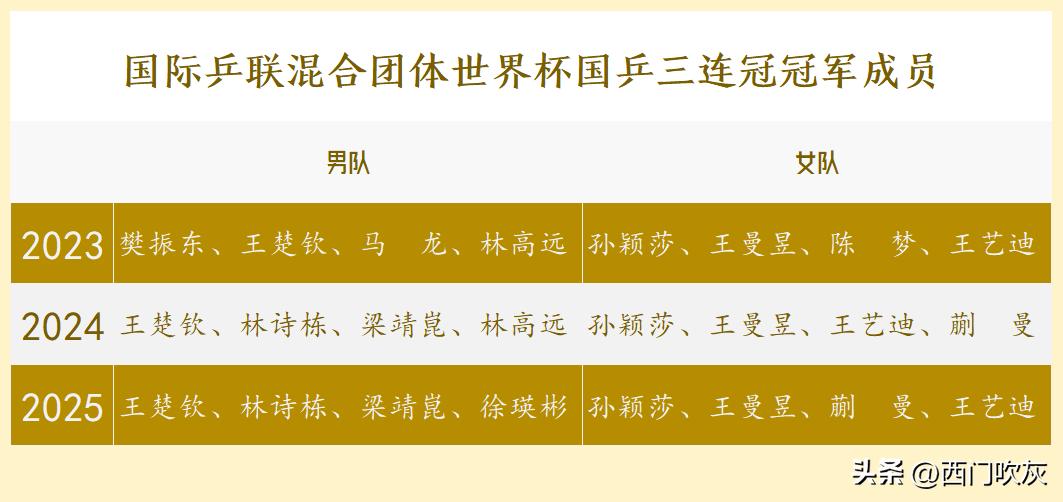 【国乒三连冠冠军成员!女队成员变化不大,男队成员变化不小!】 先看男单: 从2023到2024,樊振东、马龙由林诗栋和梁靖崑替换;从2024到2025,林高远由徐瑛彬替换;两年间当年的主力只剩王楚钦。 再看女单: 从2023到2024,陈梦离开,蒯曼加入,王艺迪排在第三;从2024到2025,人员没变,蒯曼快速崛起,与王艺迪排序互换。